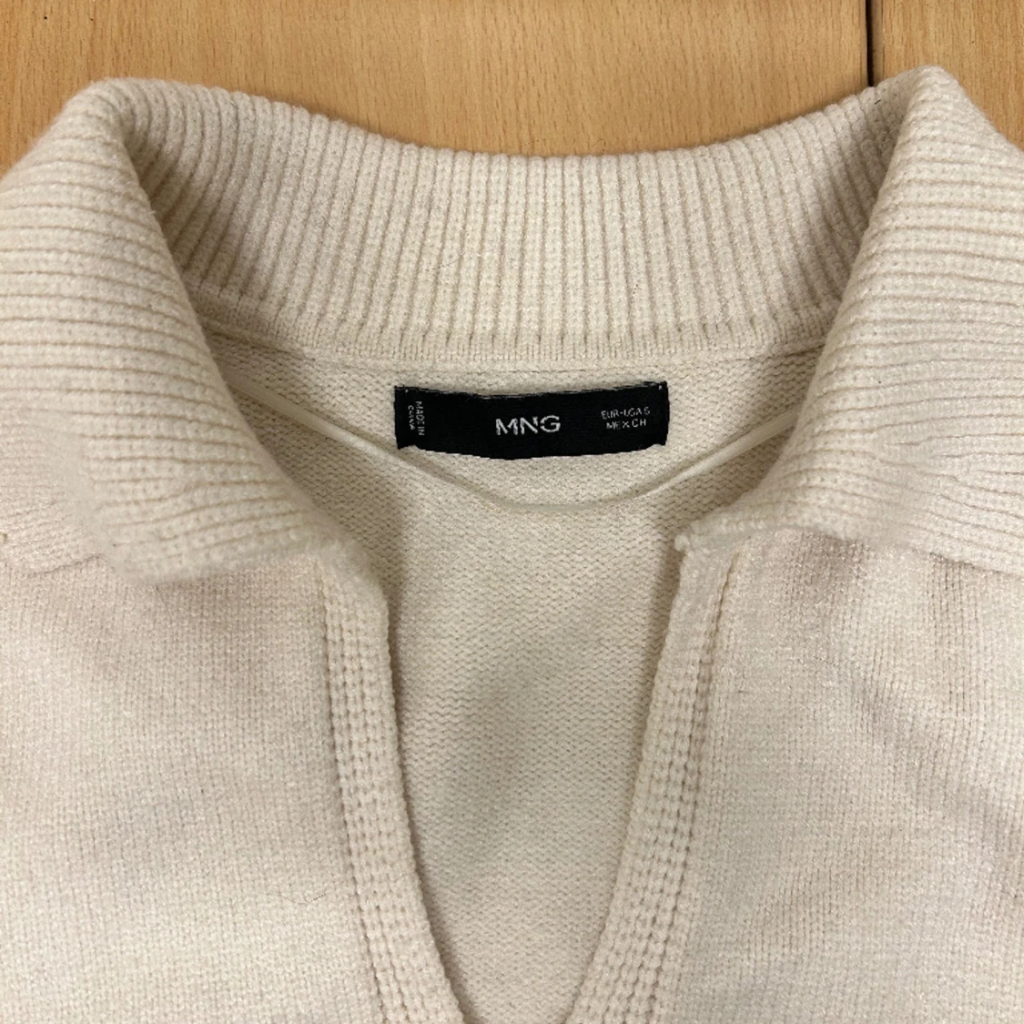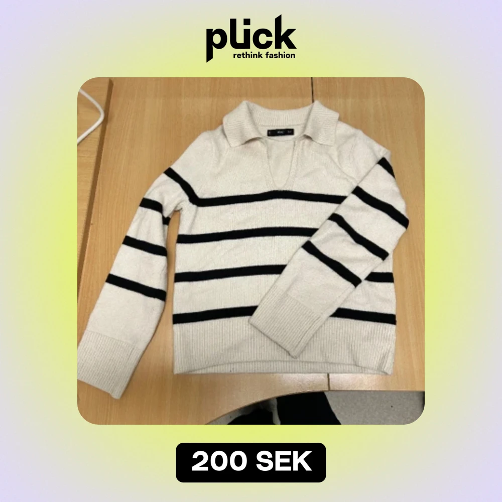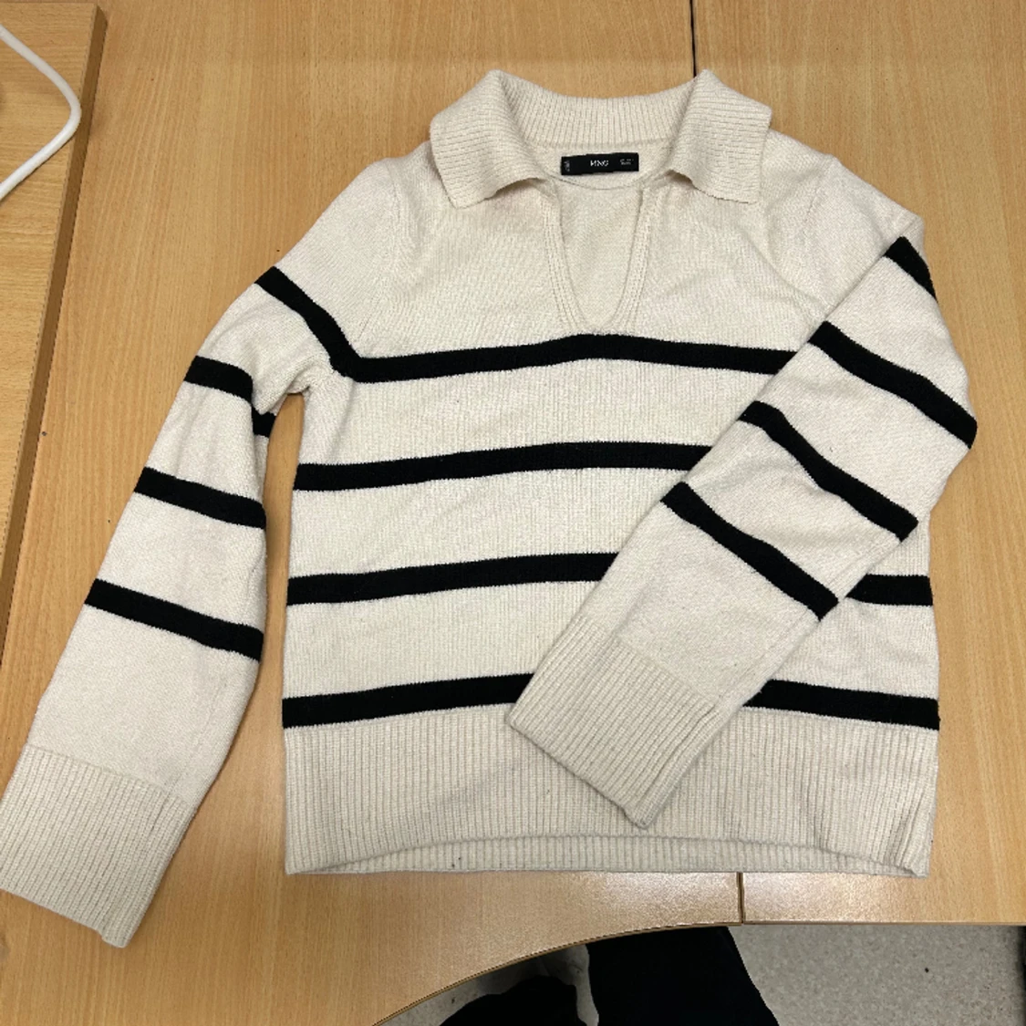 Mysig tätstickad tröja köpt under hösten. Lägger sig väldigt fint på kroppen. Varm och go. Säljer då jag har två väldigt lika. Cremevit med svarta rände