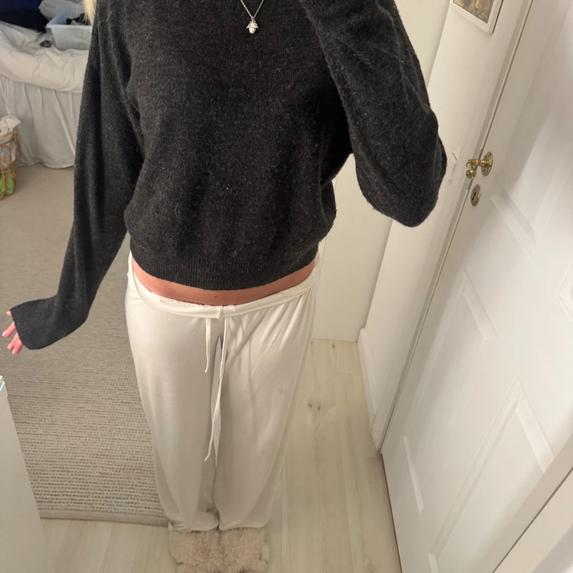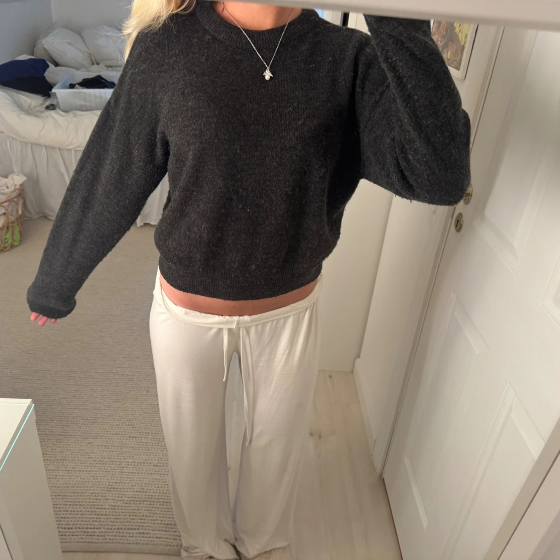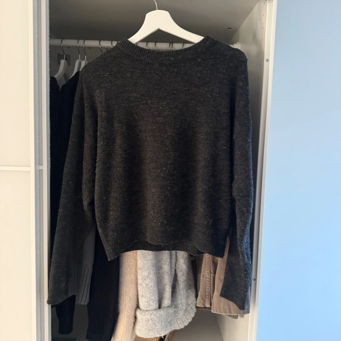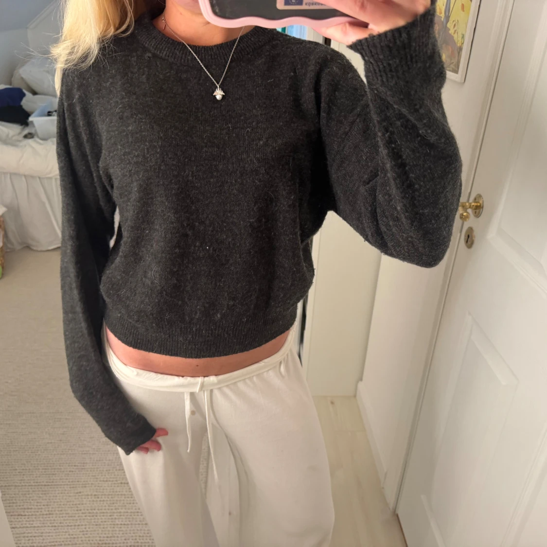 Mysig mörkgrå stickad tröja med rund hals och långa ärmar. Tröjan har en lite loose passform och ribbade muddar vid ärmslut och nederkant. Perfekt att slänga på sig när det är kyligt ute. Enkel och stilren design som funkar till allt.