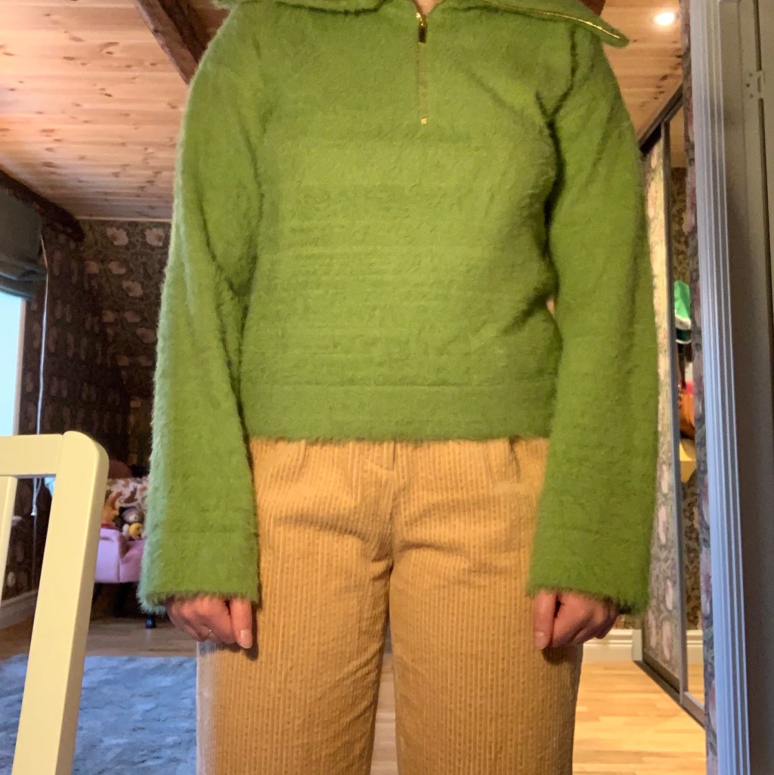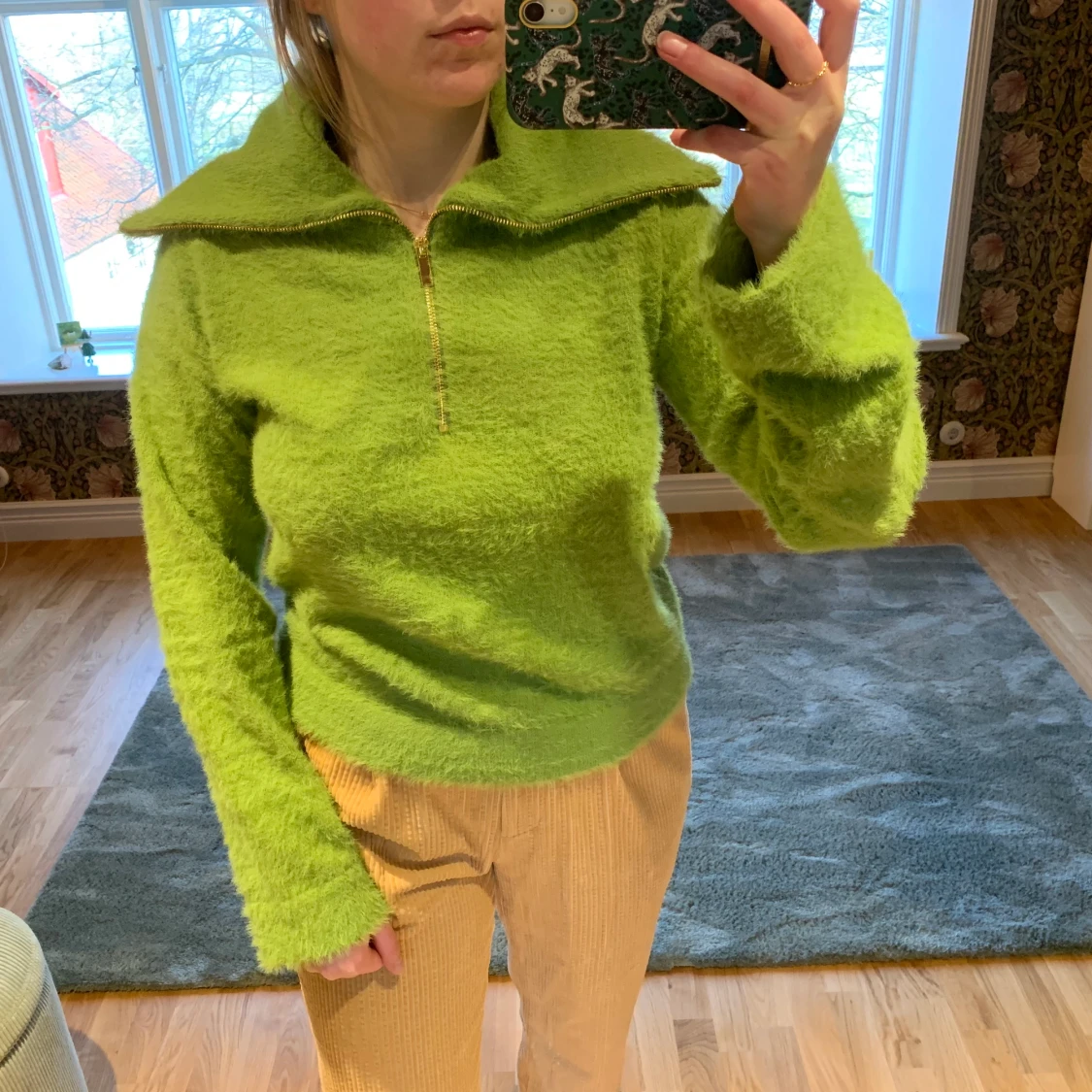Skön stickad/luden, grön tröja från NA-KD. Aldrig använd så den är i nyskick. Är i en härlig, vårlig grön färg. Lagom tjock så passar bra nu till våren! Dragkedjan gör så att man kan styla på massa olika sätt, såsom jag har på bilden är bara ett förslag! :)
