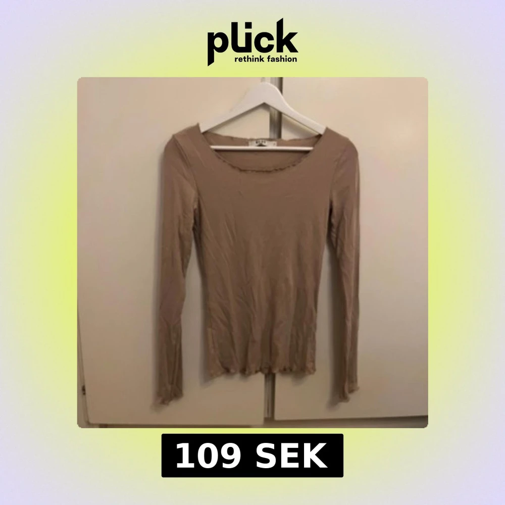 Säljer en stilren beige ribbad topp med långa ärmar. Den har en enkel design med vågig kantdetalj vid halsen och nederkanten. Perfekt för lager-på-lager eller som den är. Helt oanvänd!