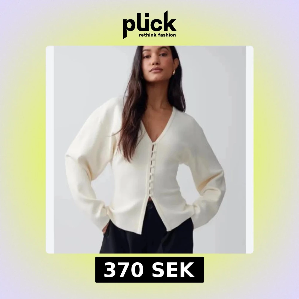 Snygg vit kofta med v-ringning och dekorativa knappar framtill. Modellen har långärmad passform och är tillverkad i ett mjukt stickat material. Perfekt att styla med jeans eller kjol för en clean look. Slutsåld❤️❤️❤️