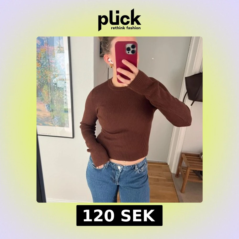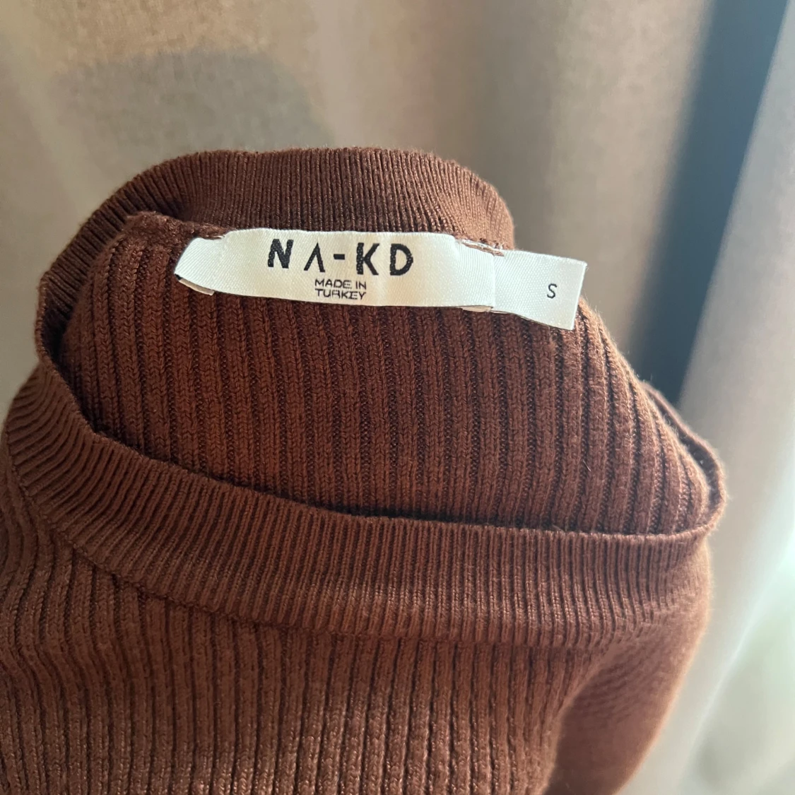 Säljer en brun ribbad långärmad tröja från NA-KD. Tröjan är croppad och har en rund halsringning. Perfekt att matcha med jeans eller kjol för en snygg vardagslook.