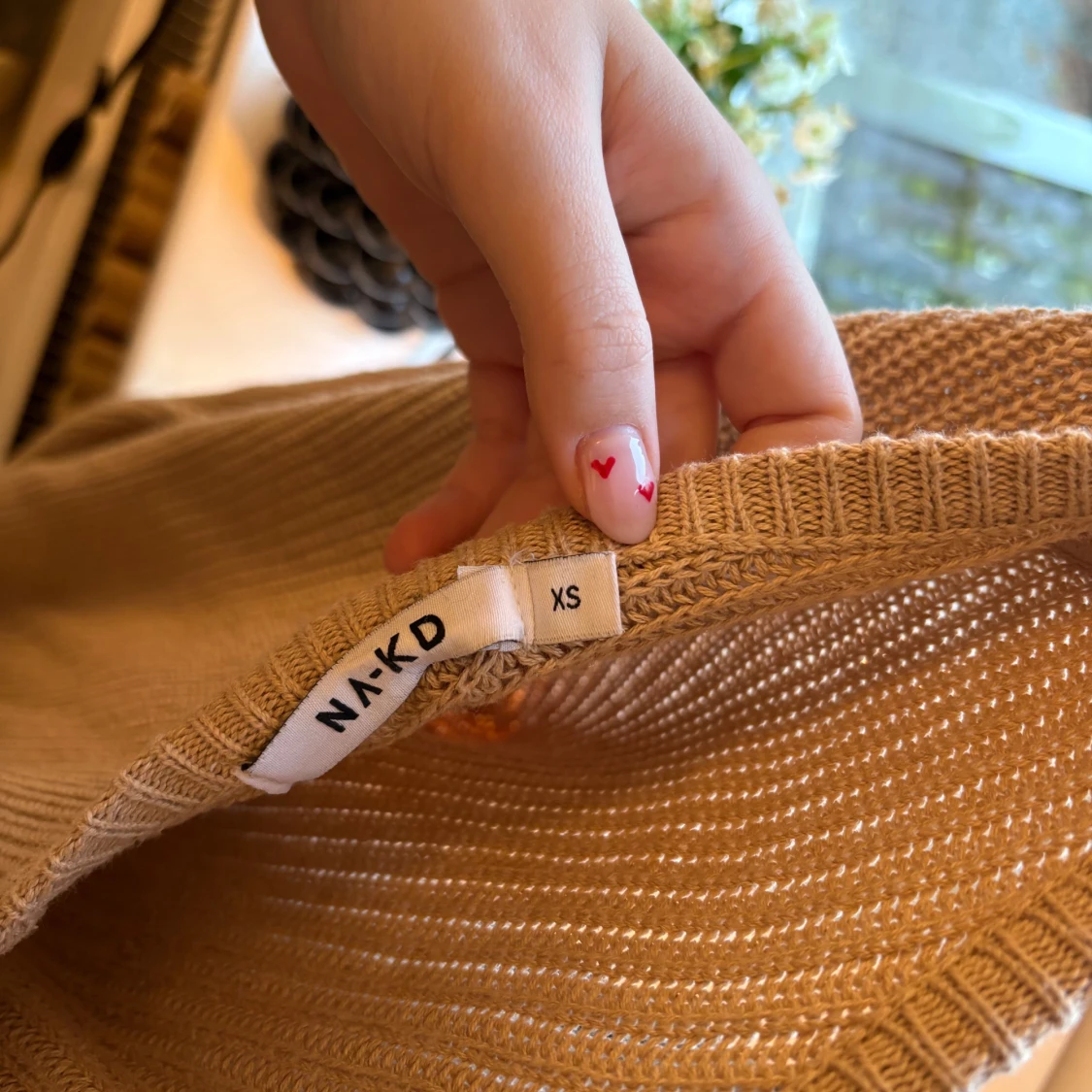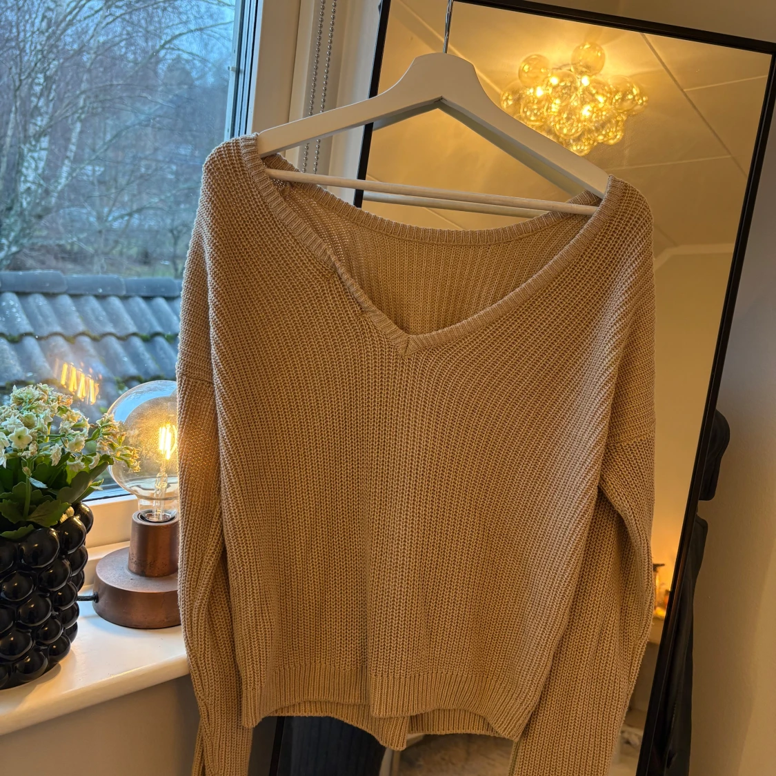 Säljer en superfin beige stickad tröja från NA-KD i storlek XS. Den har en v-ringad design och långa ärmar, perfekt för höst och vinter. Tröjan är i mycket bra skick. Han användas omvänt också🍂✨