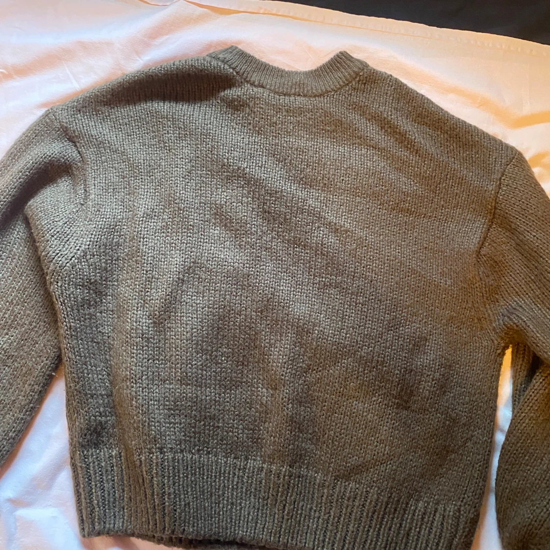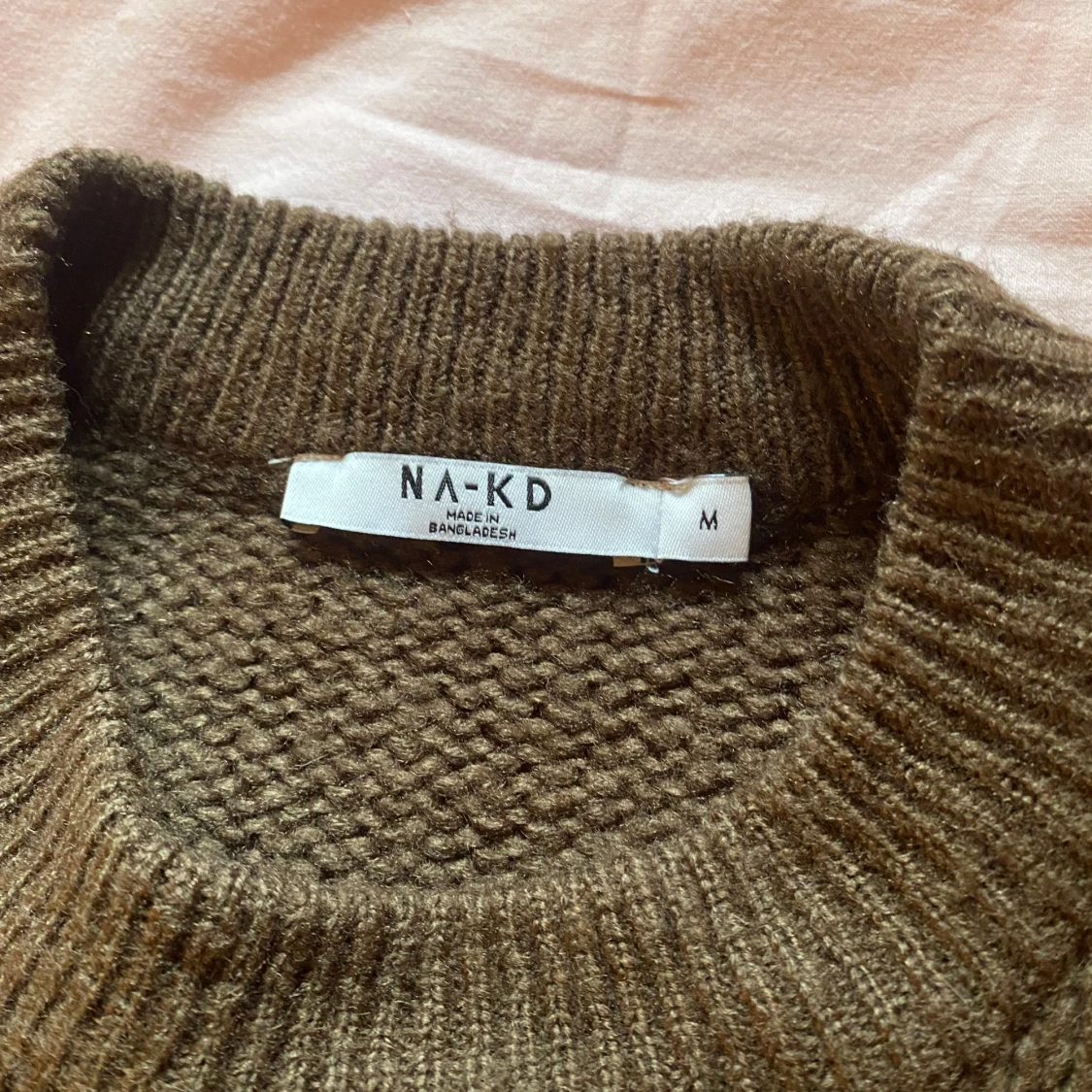 Säljer en snygg brun stickad tröja från NA-KD. Tröjan har en klassisk rund halsringning och ribbade muddar vid ärmslut och nederkant. Perfekt för kyliga dagar! 🍂