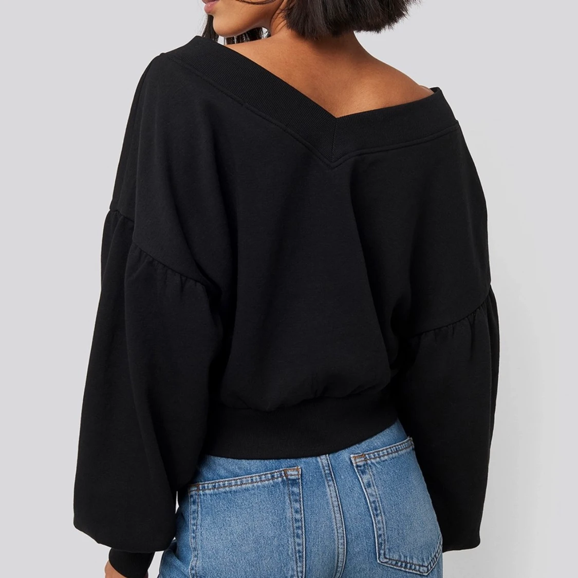 Jättemysig svart sweatshirt från NAKD. Slutsåld! Fint skick😍 storlek S. V-ringad både bak och fram.