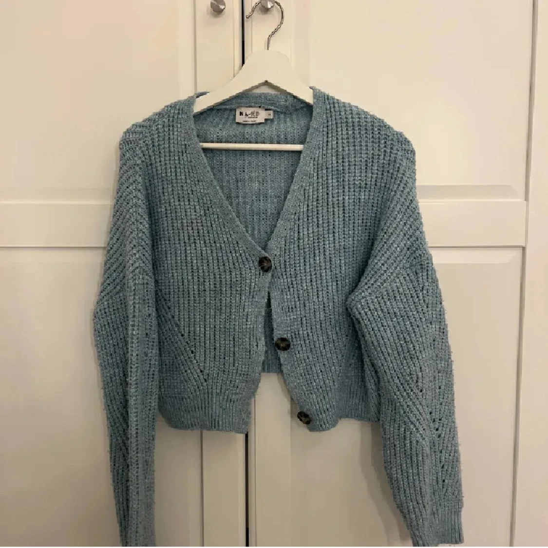Supermysig ljusblå stickad kofta från NA-KD med grov ribbad struktur och tre mörka knappar framtill. Koftan är croppad med lång ärm och v-ringad hals. Perfekt att slänga över en t-shirt för en chill look.