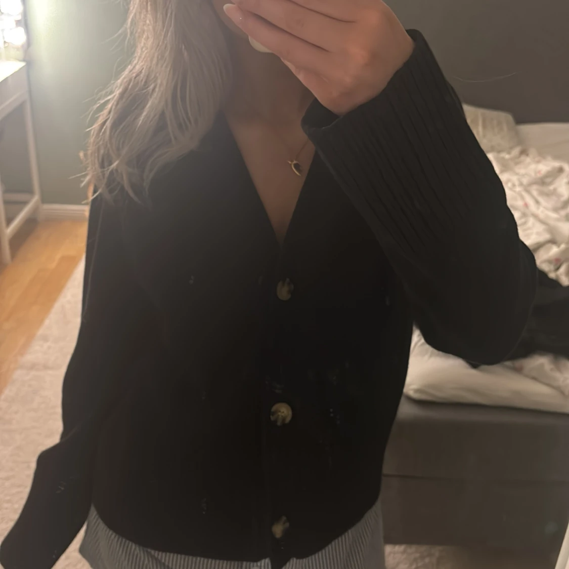 Svart stickad kofta med stora, snygga knappar framtill. Koftan har långärmad design och en klassisk v-ringning. Perfekt för lager-på-lager och passar till allt. Enkel och stilren look som funkar året runt.