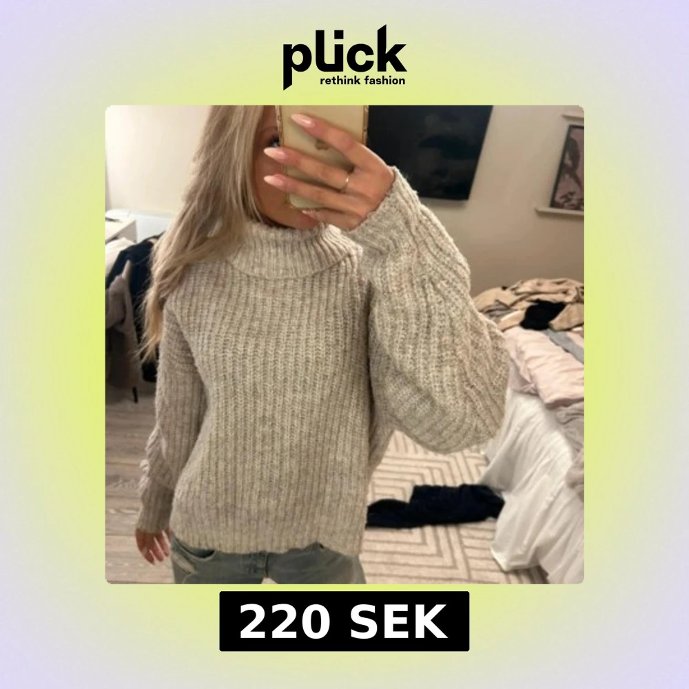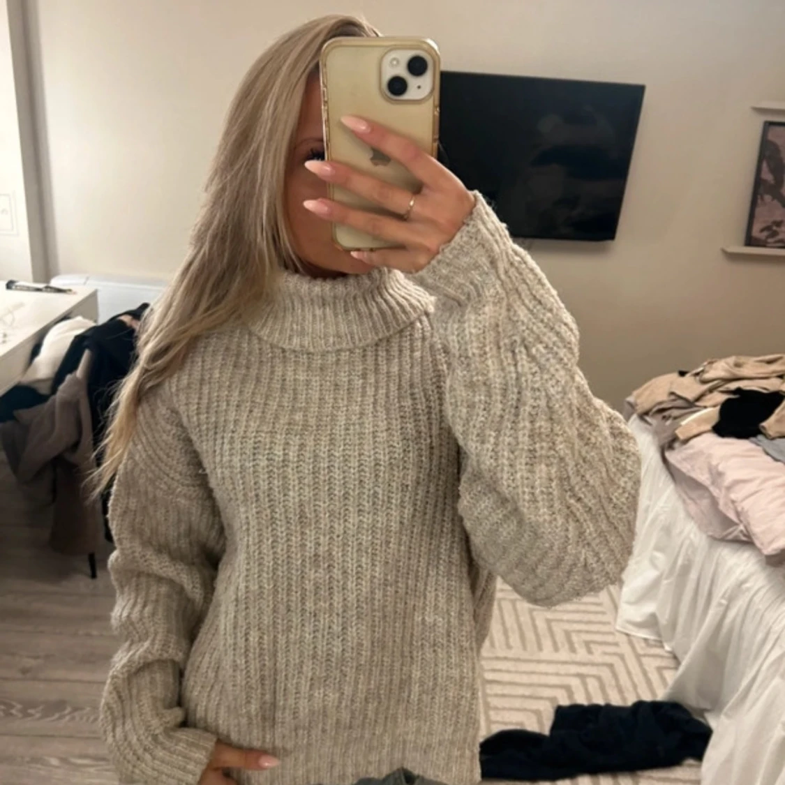 Supermysig beige stickad polotröja med grov ribbad struktur och lång ärm. Tröjan har en hög krage och en loose fit som ger en chill och avslappnad vibe. Perfekt att slänga på sig när det är kallt ute.