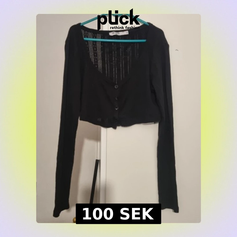 Svart bolerotopp från NA-KD med croppad passform och lång ärm. Toppen har v-ringning, knappar framtill och ett diskret ribbat mönster med små hål och ränder på ryggen. Perfekt för att ge din outfit en cool layering-effekt.