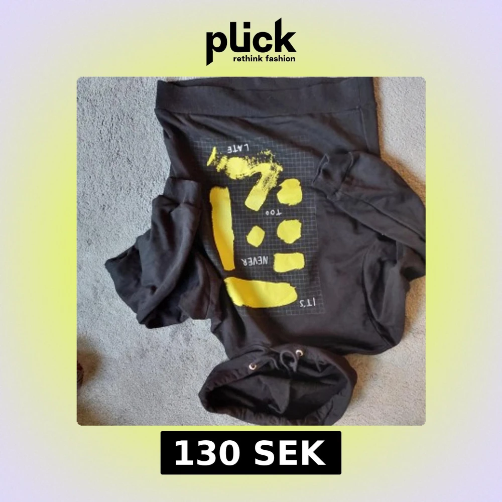 Cool svart hoodie från NA-KD i storlek S med huva och snörning. Framsidan har ett grafiskt tryck i gult med texten 'IT'S NEVER TOO LATE'. Tröjan är tillverkad i mjuk bomull och har långa ärmar samt ribbade muddar vid ärmslut och nederkant.