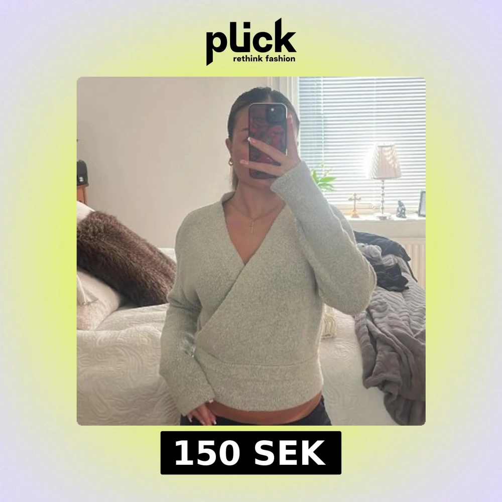 Supermysig ljusgrå omlottkofta med knyt i sidan och v-ringning. Tröjan har långa ärmar och är perfekt för lager-på-lager. Mjuk och skön, passar till många olika outfits.