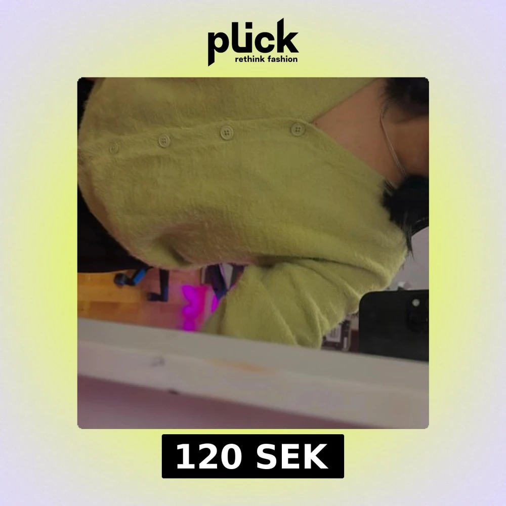 Säljer en mysig grön kofta med knappar framtill. Koftan har långa ärmar och är perfekt för kyligare dagar. Den har en mjuk och fluffig textur som ger extra komfort.