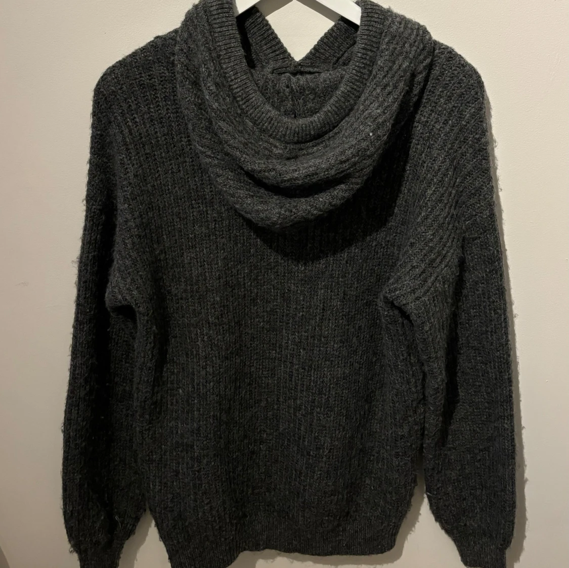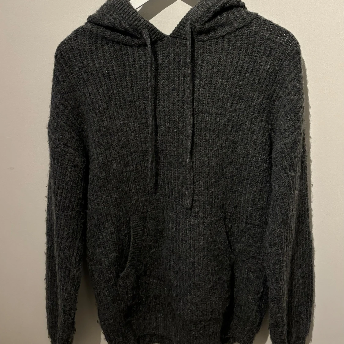 Mysig grå stickad hoodie från NA-KD med en stor huva och dragsko. Perfekt för kyliga dagar med sin ribbade struktur och praktiska magficka. En stilren och bekväm tröja för alla tillfällen.