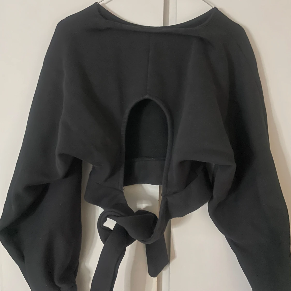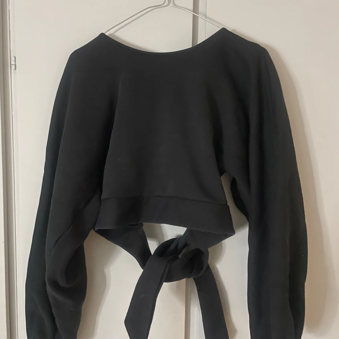 Säljer denna fina svart croppade tröja med långa ärmar med öppen rygg och knytning i ryggen. Använd ett fåtal gånger och finns inte på NA-KD längre🖤🖤🖤