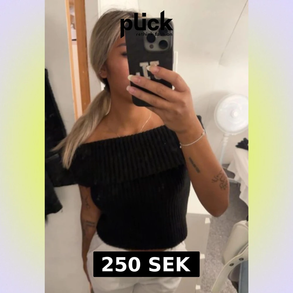 Säljer en svart ribbad offshoulder topp med bred krage som vilar snyggt över axlarna. Toppen är croppad och har en tight passform som framhäver figuren. Perfekt att styla med både jeans och kjol för en trendig look. Storlek xxs men stor i storlek bruka ha S