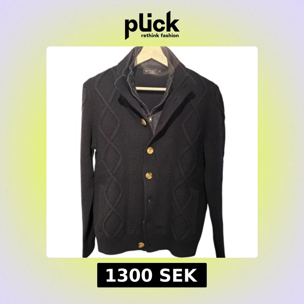Navy svart stickad kofta från Hackett med knappar och dragkedja. Den har ett elegant mönster och är perfekt för kyligare dagar. Koftan är tillverkad i ull och har en stilren design med ribbade detaljer.