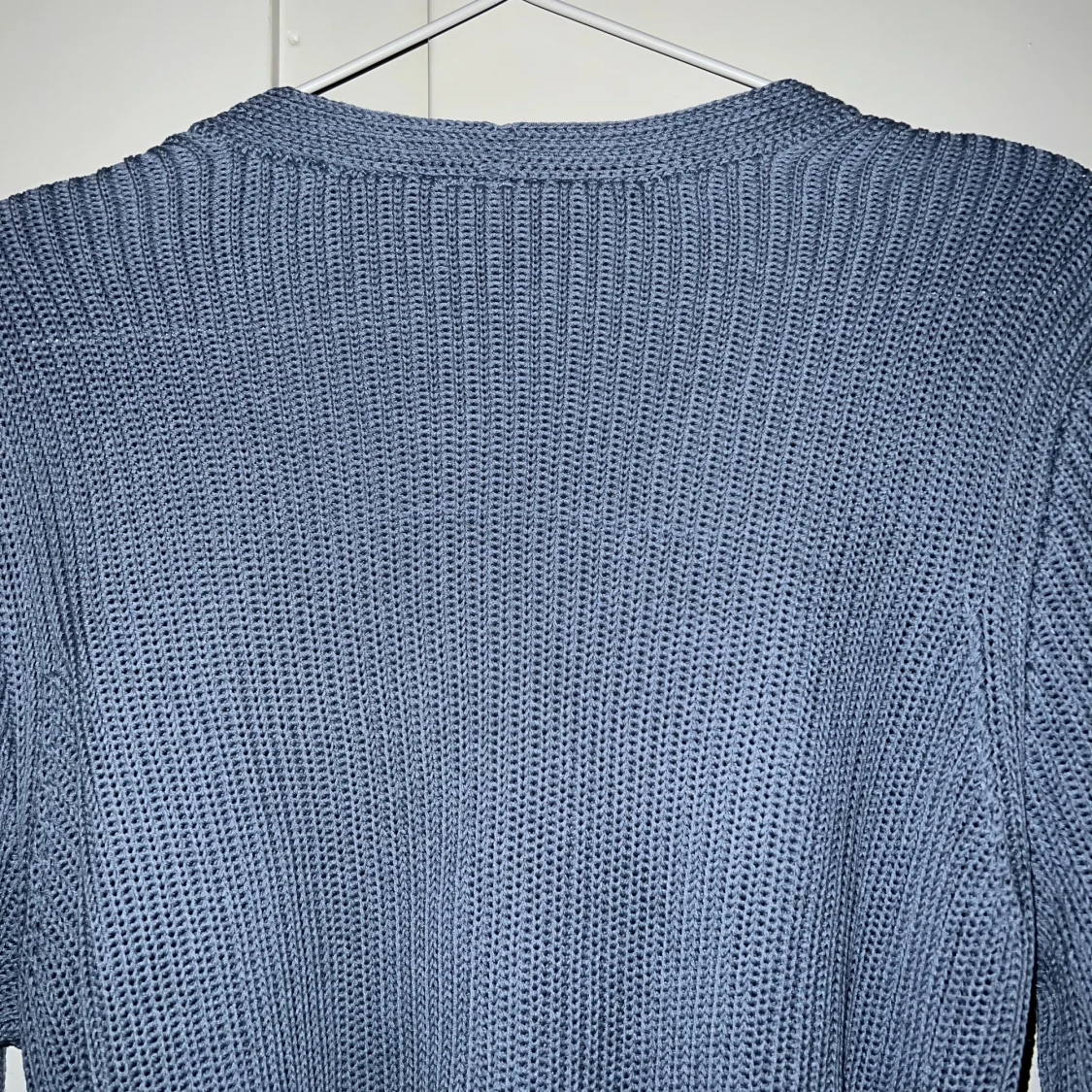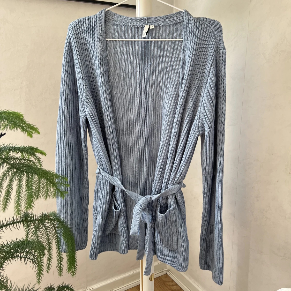 Blå stickad kofta från Nelly i storlek S. Använd 1 gång men fastnat i ett annat klädesplagg och gjort en liten reva på ett ryggen, syns mer på insidan än på utsidan. Annars i ett bra nytt skick.💙