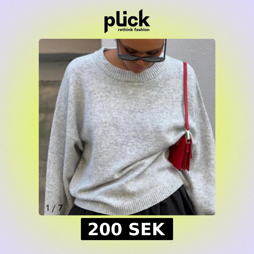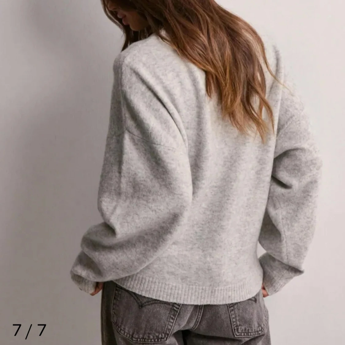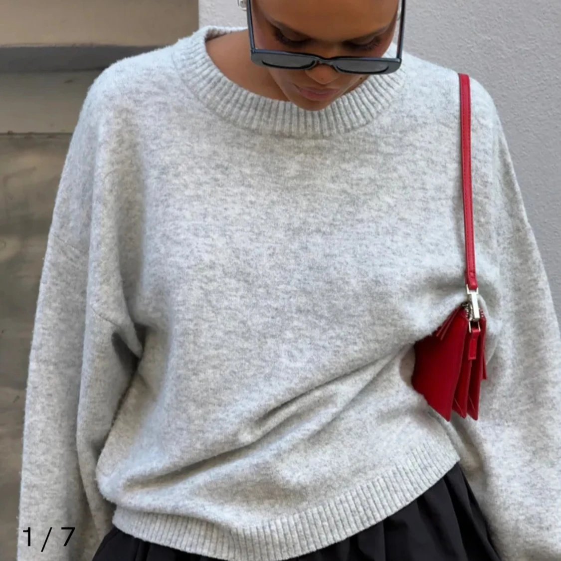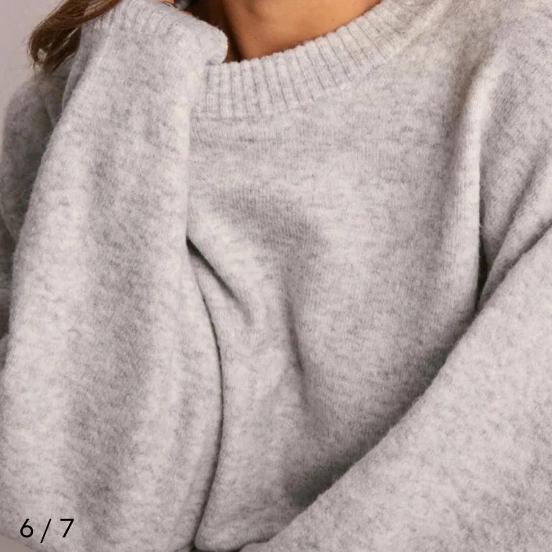 Mysig grå stickad tröja med rund hals och långa ärmar. Perfekt för kyliga dagar med sin mjuka och bekväma passform. Ribbstickade muddar vid ärmslut och nederkant ger en stilren look.