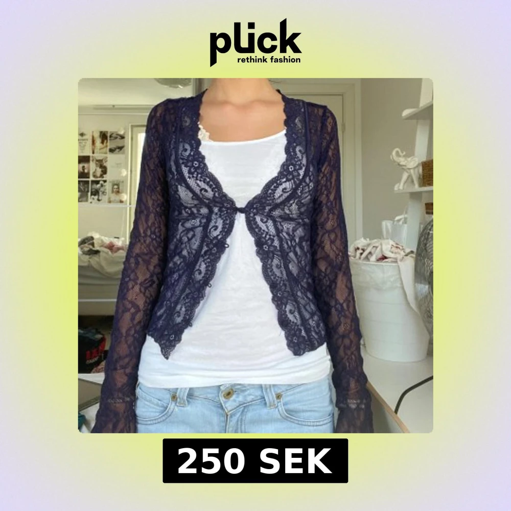 Säljer en mörkblå, transparent spetskofta med långärmad design. Koftan har vacker spets med blommönster och en öppen front som knyts framtill. Perfekt att slänga över ett linne eller t-shirt för en extra touch till outfiten.