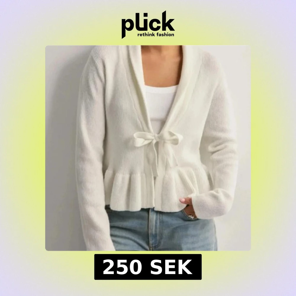 Säljer en söt vit stickad kofta med knytband framtill. Koftan har långa ärmar och en volangdetalj vid nederkanten. Perfekt för en mysig och stilren look. Från Nelly och endast använd en gång! Jätte mysig❤️ hör av er vid frågor, jag postar så snart jag kan!