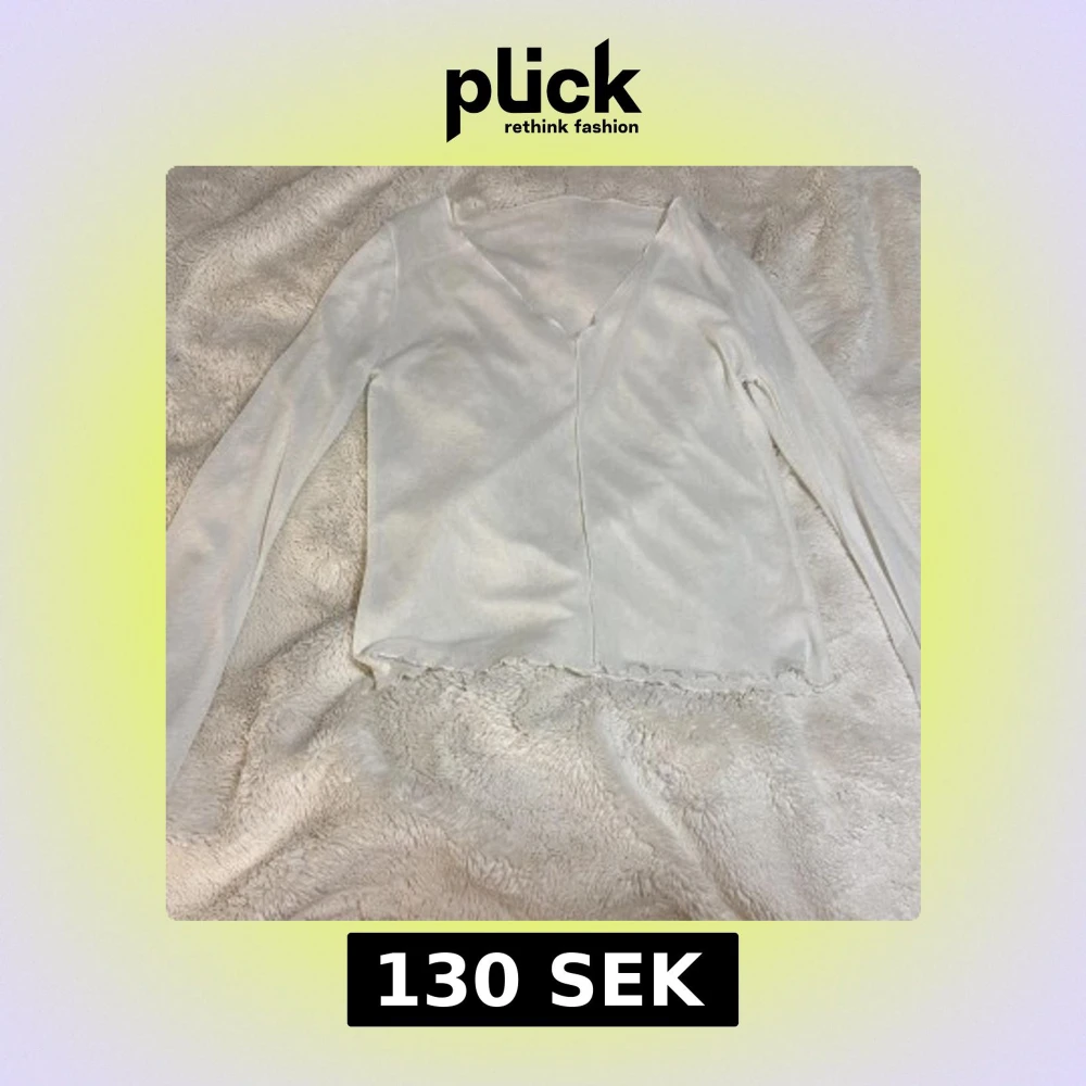 Säljer en stilren vit långärmad topp med v-ringning. Toppen har en enkel design med vågig kant vid nederdelen som ger en fin detalj. Den är genomskinlig, och passar bra till lite mer off shoulder.