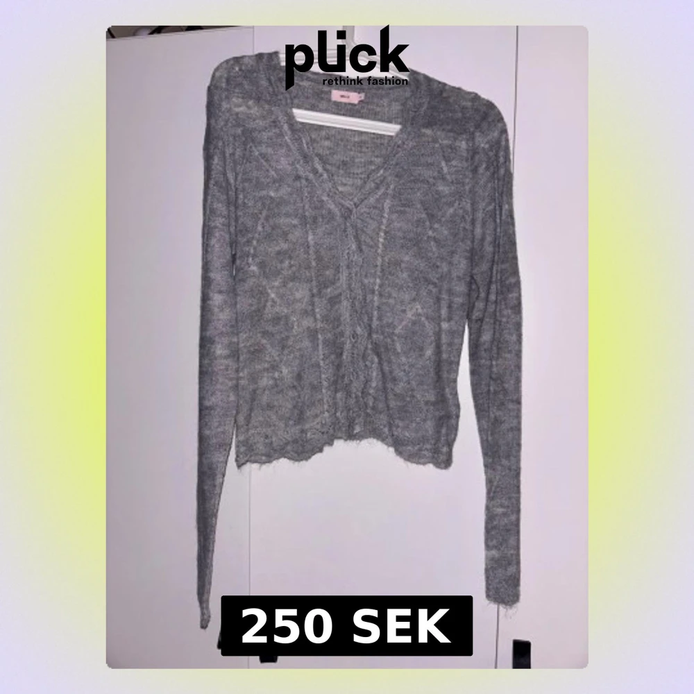 Säljer en grå stickad kofta från Nelly med v-ringad hals och knappar framtill. Koftan har ett diskret mönster och långa ärmar. Den är mjuk och har en lite ruffad kant nedtill för en chill vibe. Perfekt att slänga på över en t-shirt.