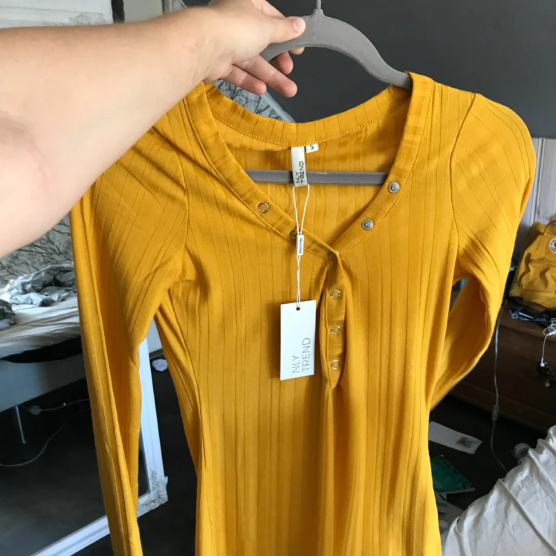 En helt ny gul tröja från Nelly. Är i storlek S, knappar som går att stänga och öppna.