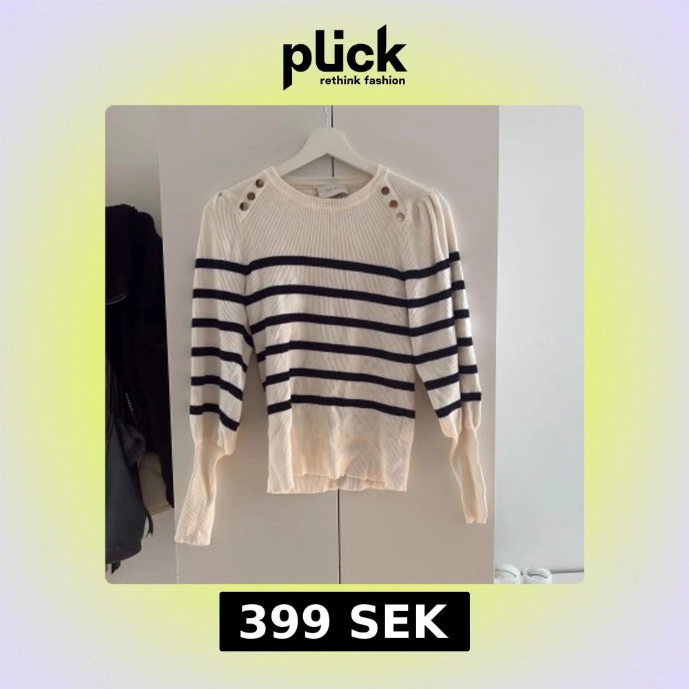 Superfin tröja från Neo Noir med svarta ränder och snygga knappar på axlarna. Tröjan har puffiga långärmar och en klassisk rund halsringning. Perfekt för dig som gillar en stilren men trendig look.