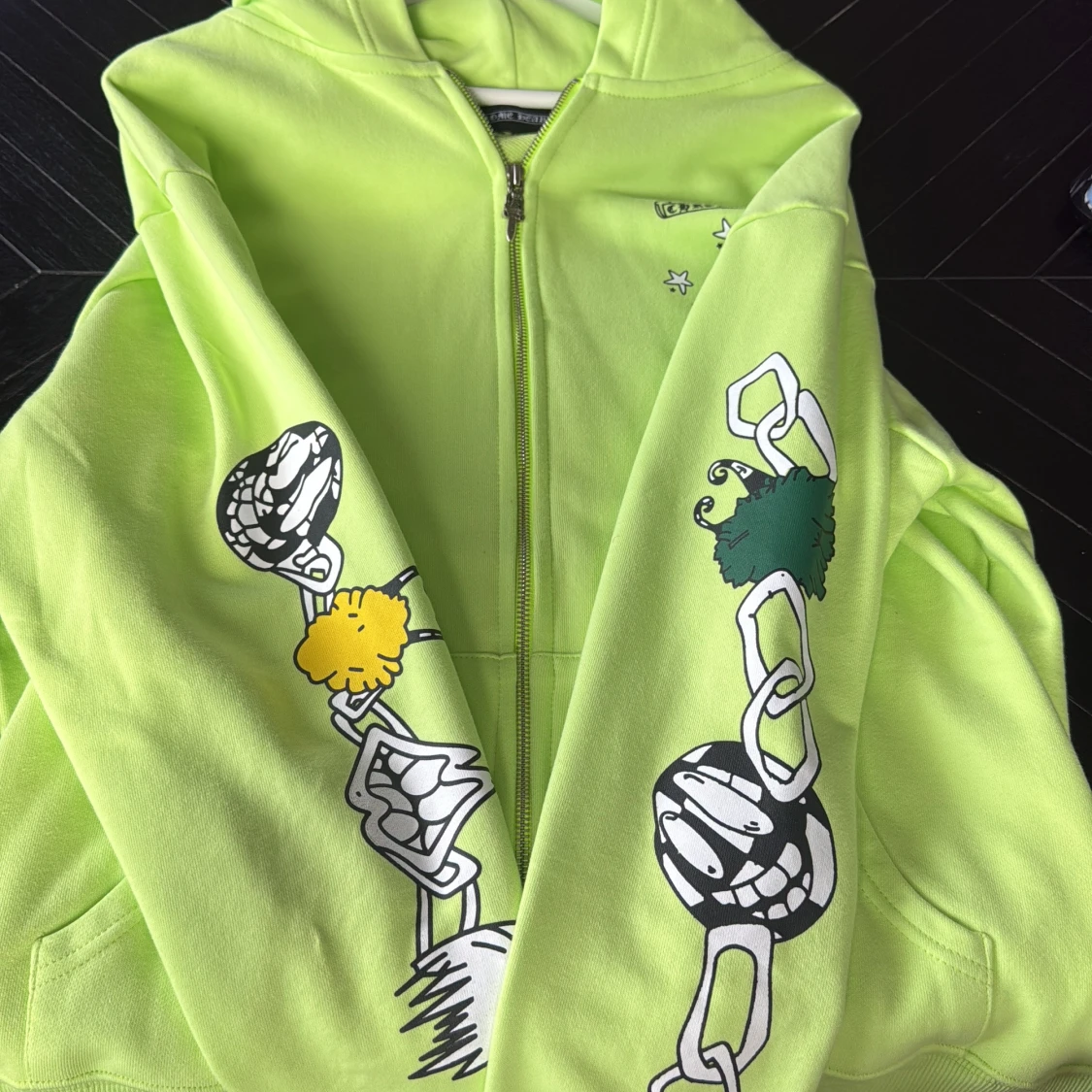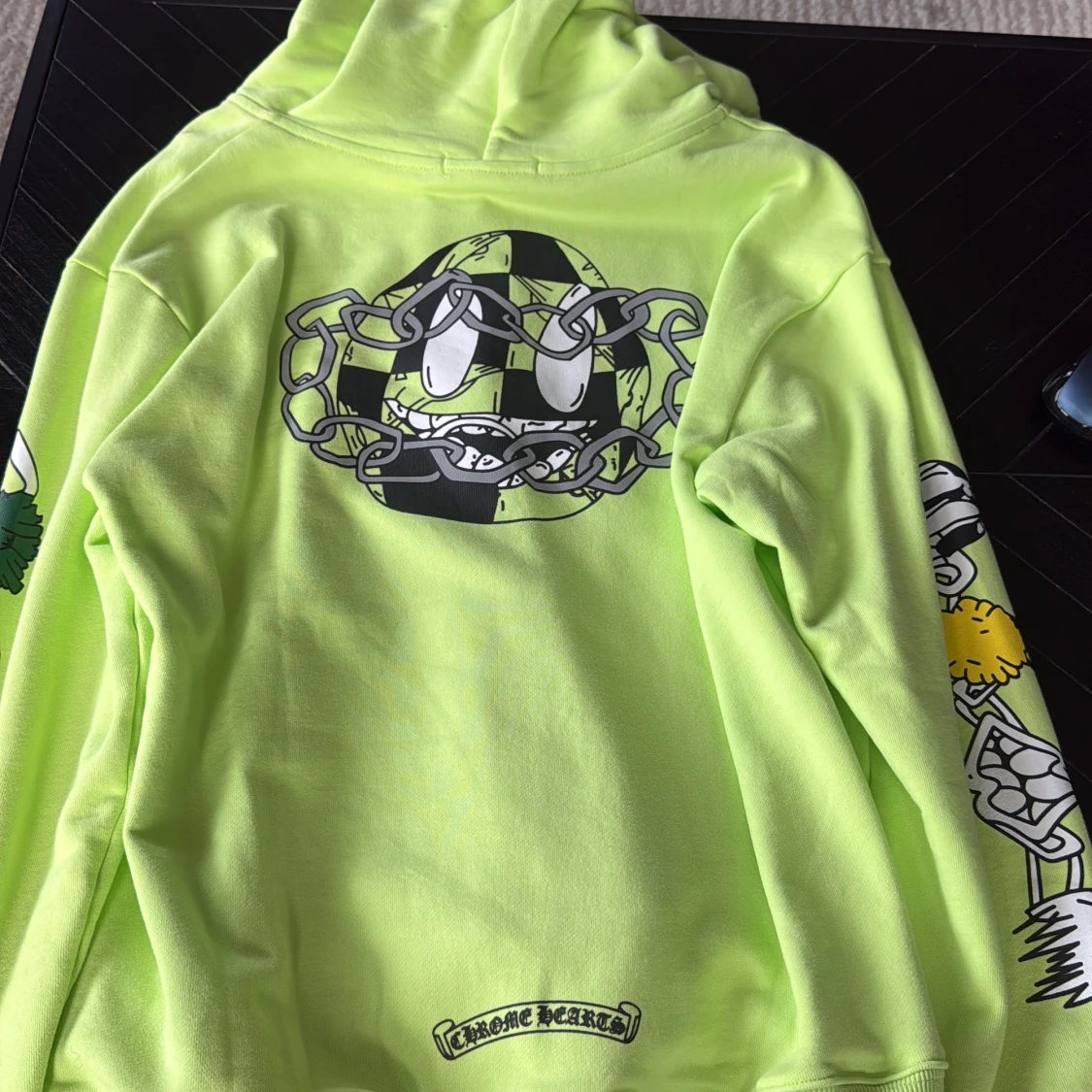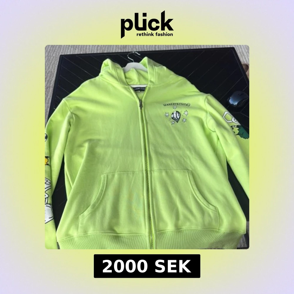 Säljer en neongul hoodie från Chrome Hearts med coola grafiska tryck på både ärmar och rygg. Tröjan har huva, dragkedja framtill och stora fickor. Materialet är mjuk bomull och designen är riktigt unik med kedjor och färgglada detaljer.