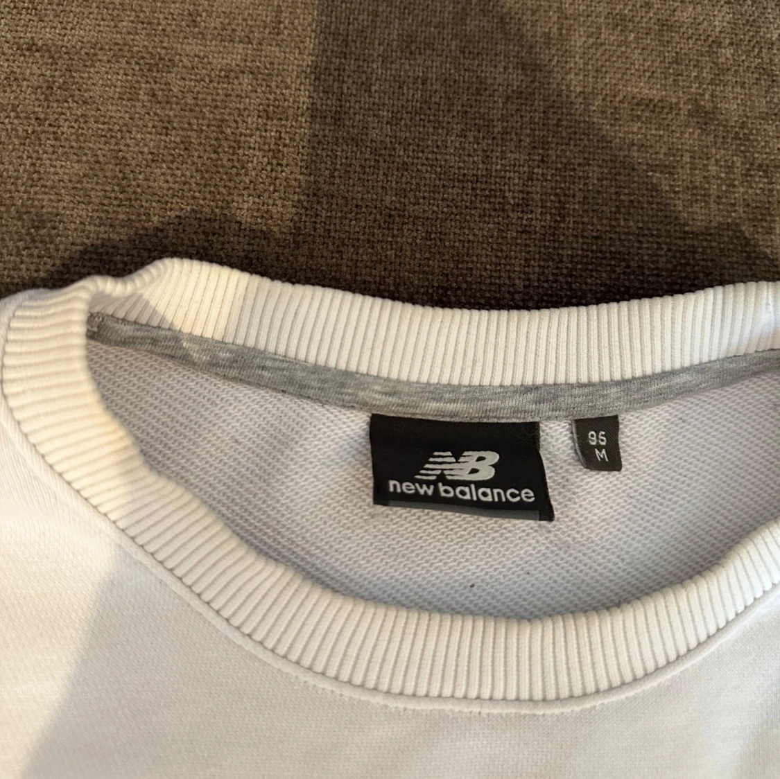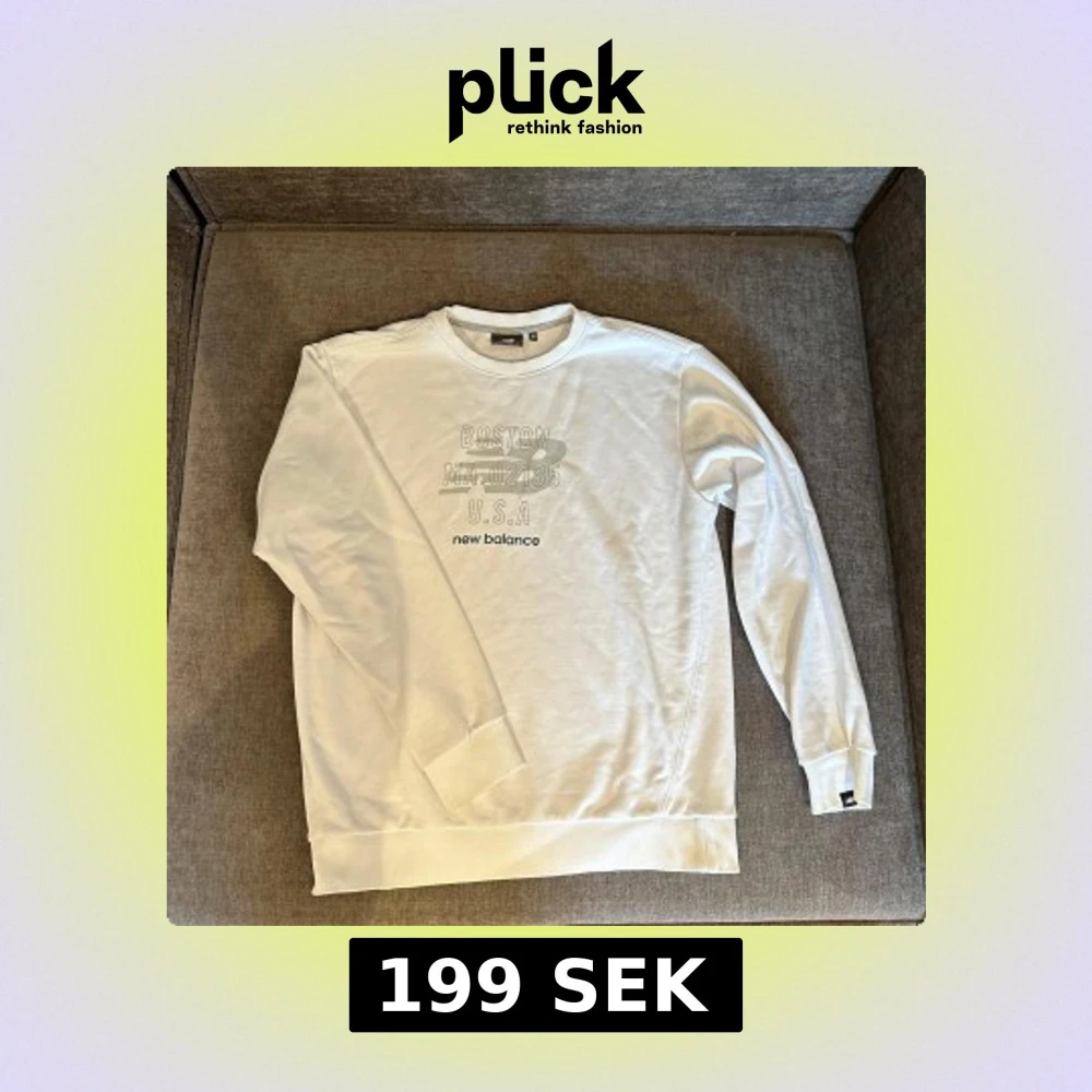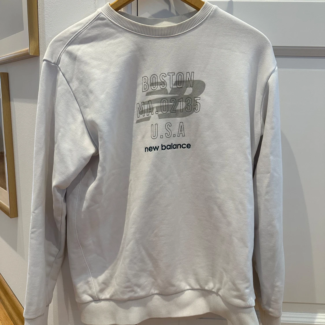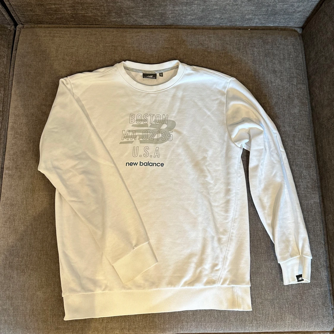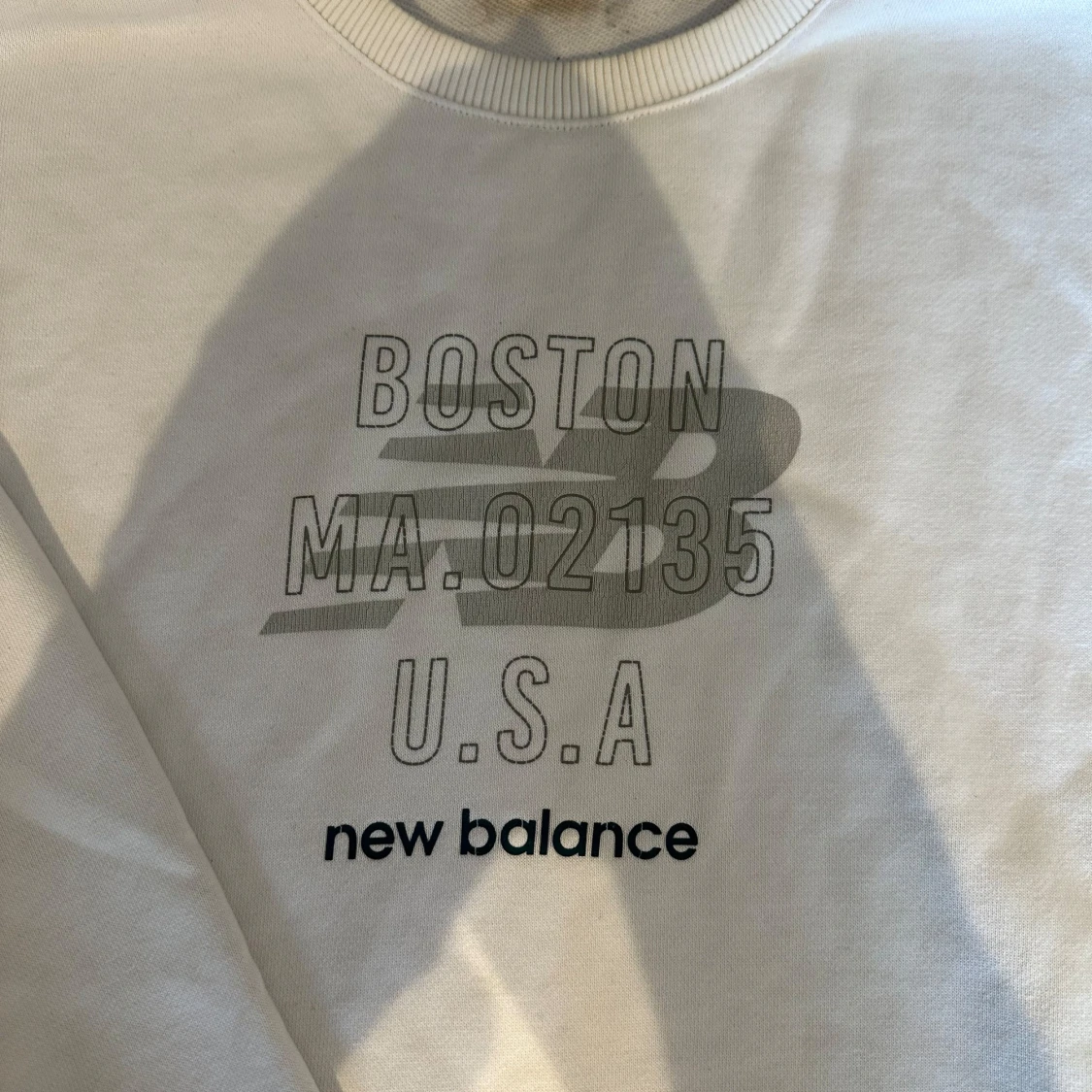 Säljer en stilren vit sweatshirt från New Balance med tryck som refererar till Boston, USA. Tröjan har långa ärmar och en rund halsringning. Perfekt för en avslappnad stil. Storlek M sitter som S