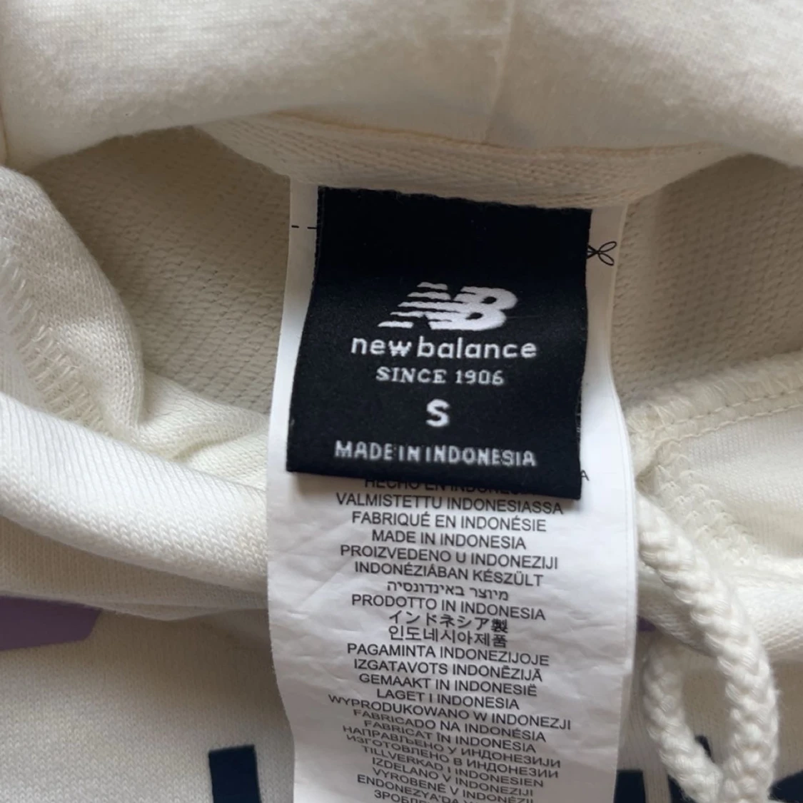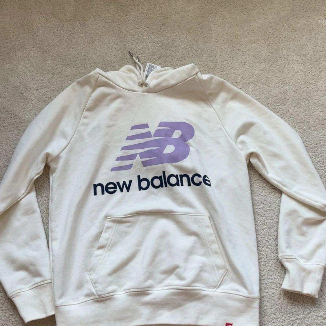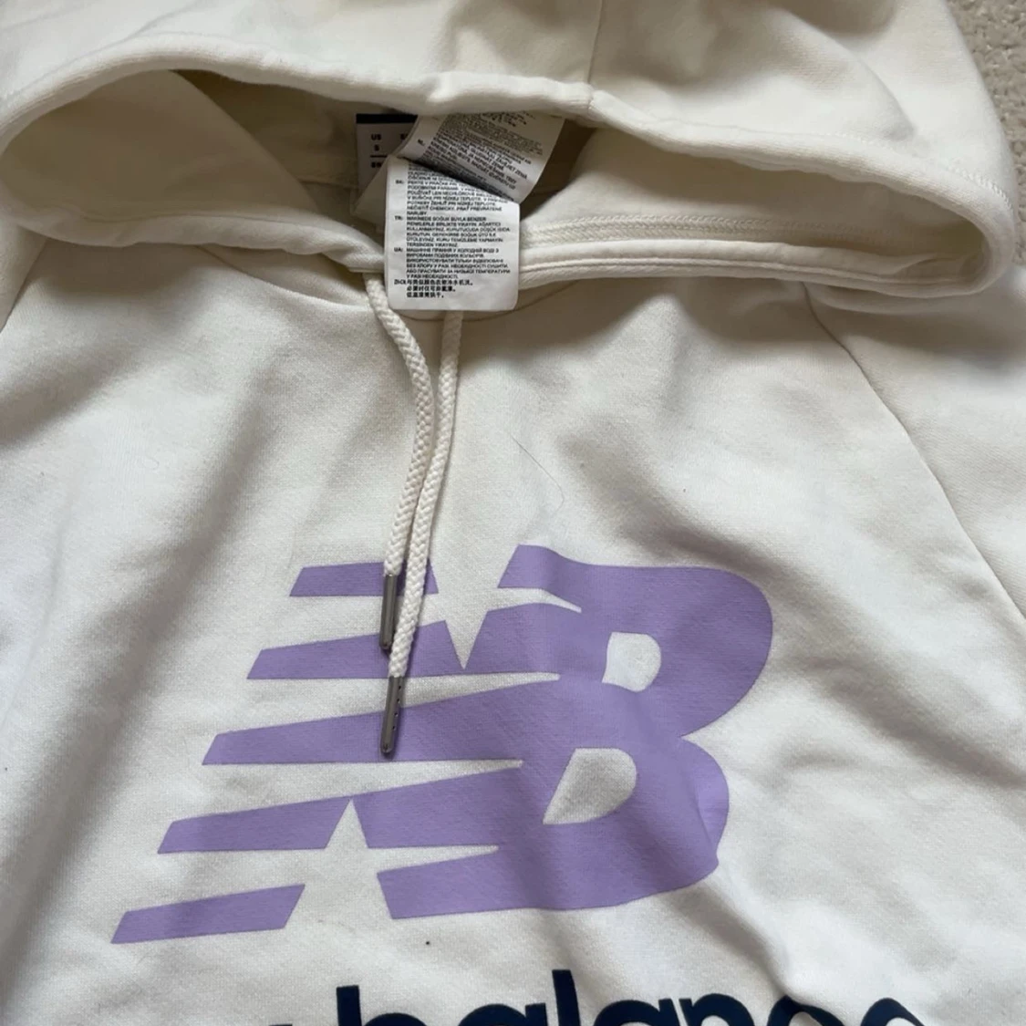 Snygg vit hoodie från New Balance i storlek S med lila logga framtill och svart text. Tröjan har huva med snörning och en stor magficka. Perfekt för en chill och sportig look. Tillverkad i mjuk bomullsmix som känns skön mot huden.