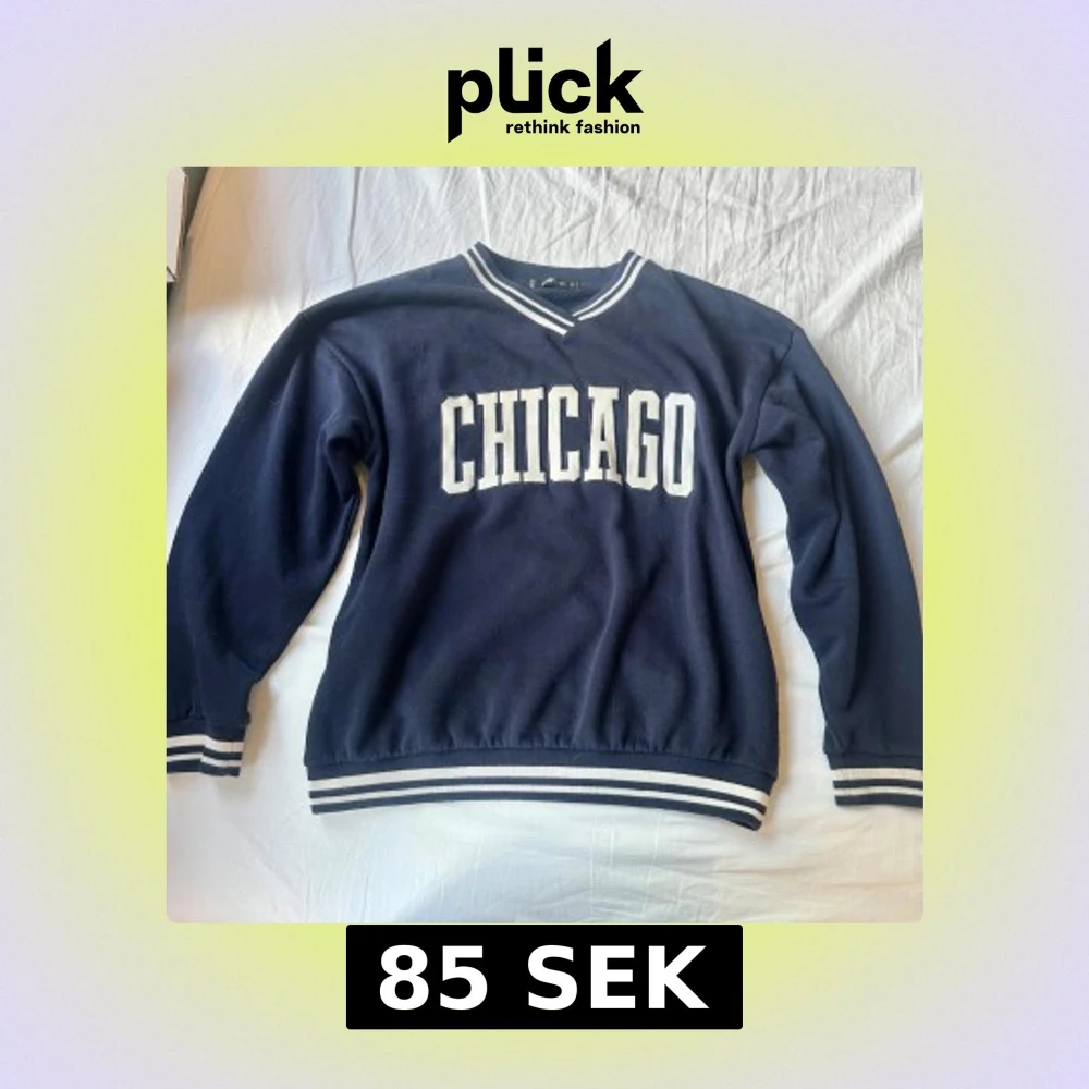 En marinblå tjocktröja med texten ”Chicago” på som inte kommer till användning. Obs. Går ej ned i pris