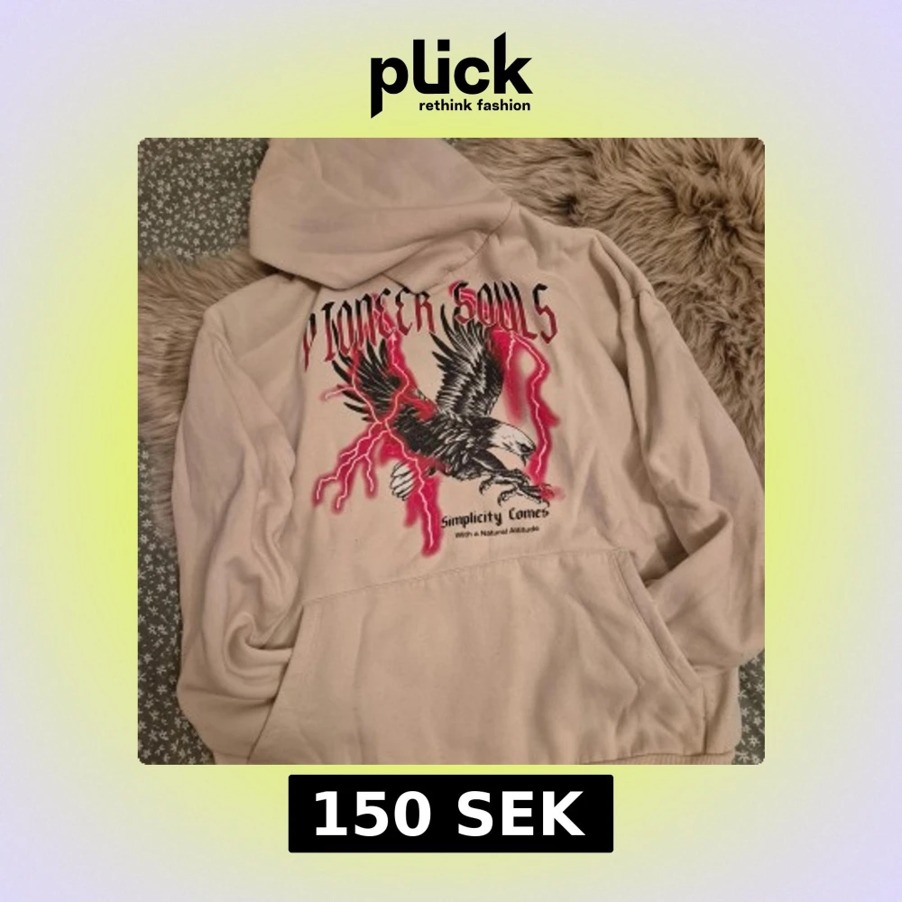 Säljer en beige hoodie med ett coolt tryck av en örn och texten 'Pioneer Souls' i rött. Hoodien har en stor ficka framtill och en bekväm passform. Perfekt för en avslappnad stil.