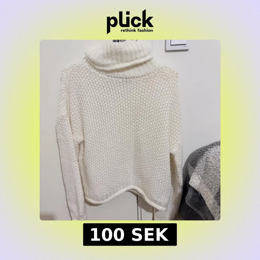 Mysig vit stickad polotröja med grovstickad struktur och hög, ribbad polokrage. Perfekt för kyliga dagar och enkel att styla med jeans eller kjol. Storlek S
