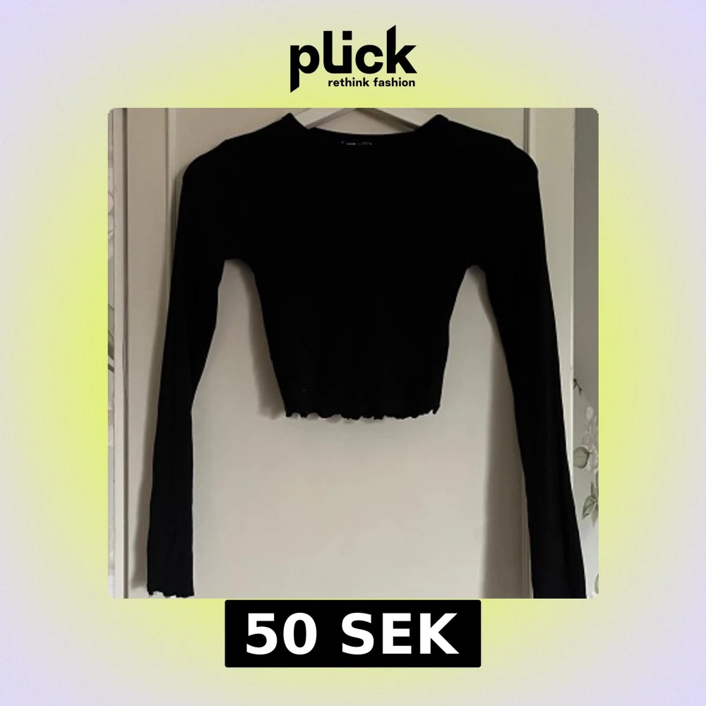 Säljer en svart croppad långärmad tröja med vågig kant nertill. Tröjan är ribbad och har en tight passform men är väldigt strechig.