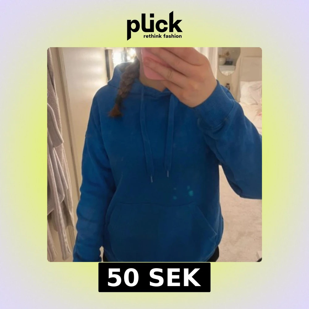 Säljer en enkel blå hoodie med huva och känguruficka framtill. Tröjan har långa ärmar. Har klippt bort lappen men kommer ihåg att det är storlek S och att den är ifrån New Yorker.