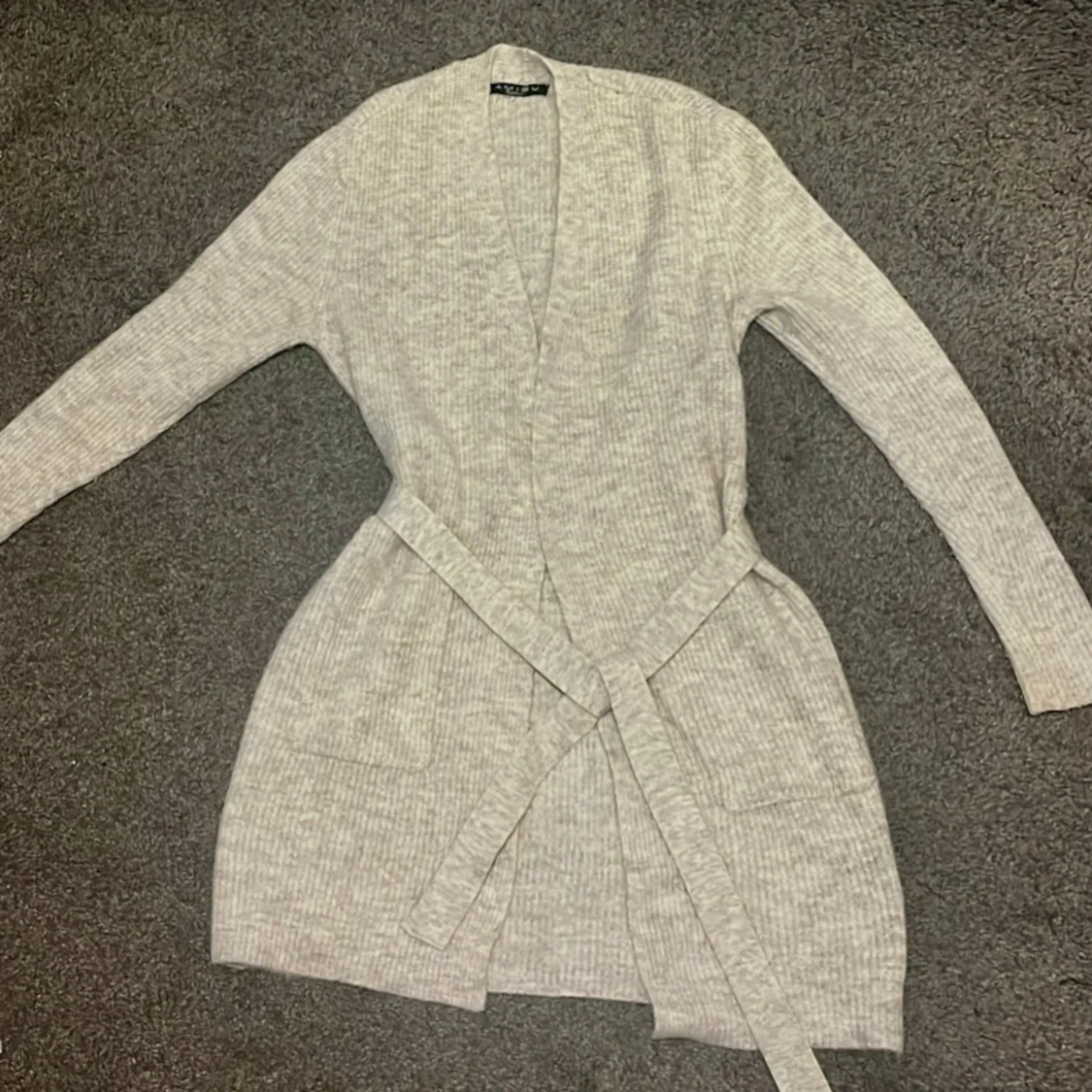 Mysig ljusgrå kofta med ribbad struktur och knytskärp i midjan. Koftan har långa ärmar och två stora fickor framtill. Perfekt att slänga på sig för en avslappnad och stilren look👚🩶
