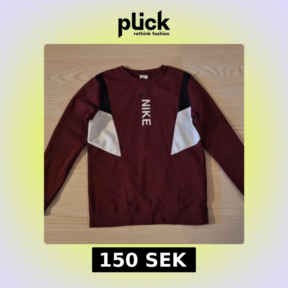 Nyskick, snvänd ett fåtal gånger. Snygg vinröd sweatshirt från Nike med vit logga framtill. Tröjan har svarta och vita paneler på axlar och sidor, rund hals och långa ärmar. Perfekt för en sportig och avslappnad stil.