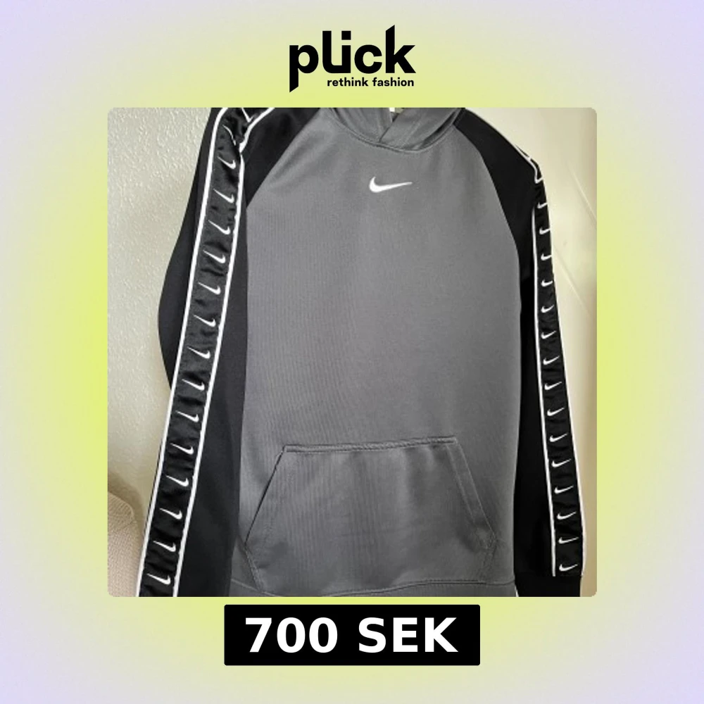 Snygg grå och svart hoodie från Nike i storlek XL. Tröjan har huva, lång ärm och en stor magficka. Ärmarna har svarta paneler med vita Nike-loggor längs sidorna och en vit piping. Perfekt för chill eller träning.
