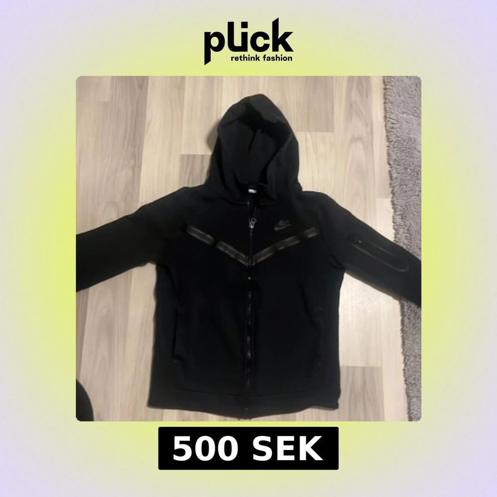 Säljer en svart hoodie från Nike med dragkedja och huva. Den har långa ärmar och ett diskret Nike-logotyp på bröstet. Perfekt för en sportig look eller avslappnade dagar.