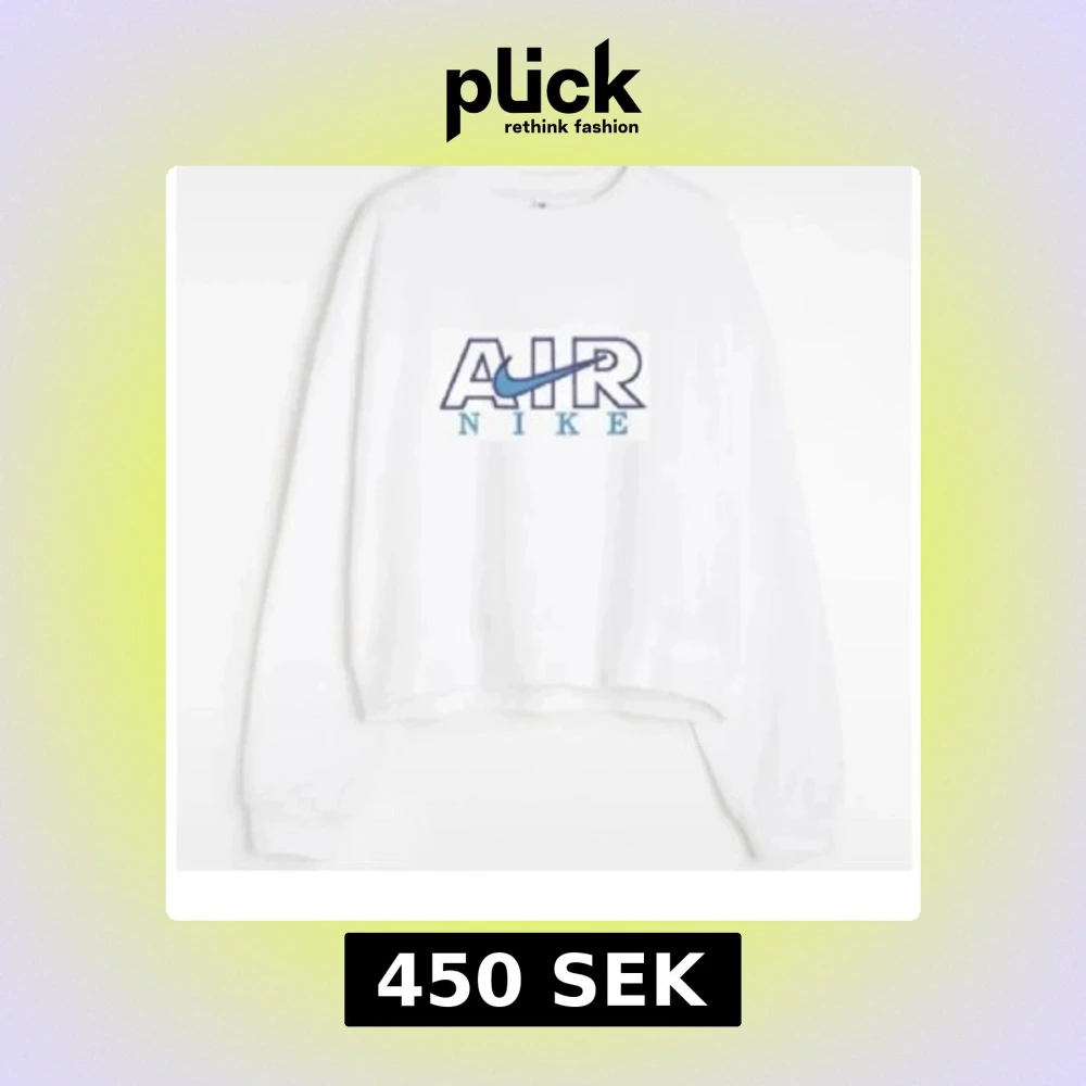 Säljer en vit sweatshirt från Nike med blått och svart tryck på framsidan. Tröjan har långa ärmar och en klassisk rund halsringning. Perfekt för en avslappnad stil.