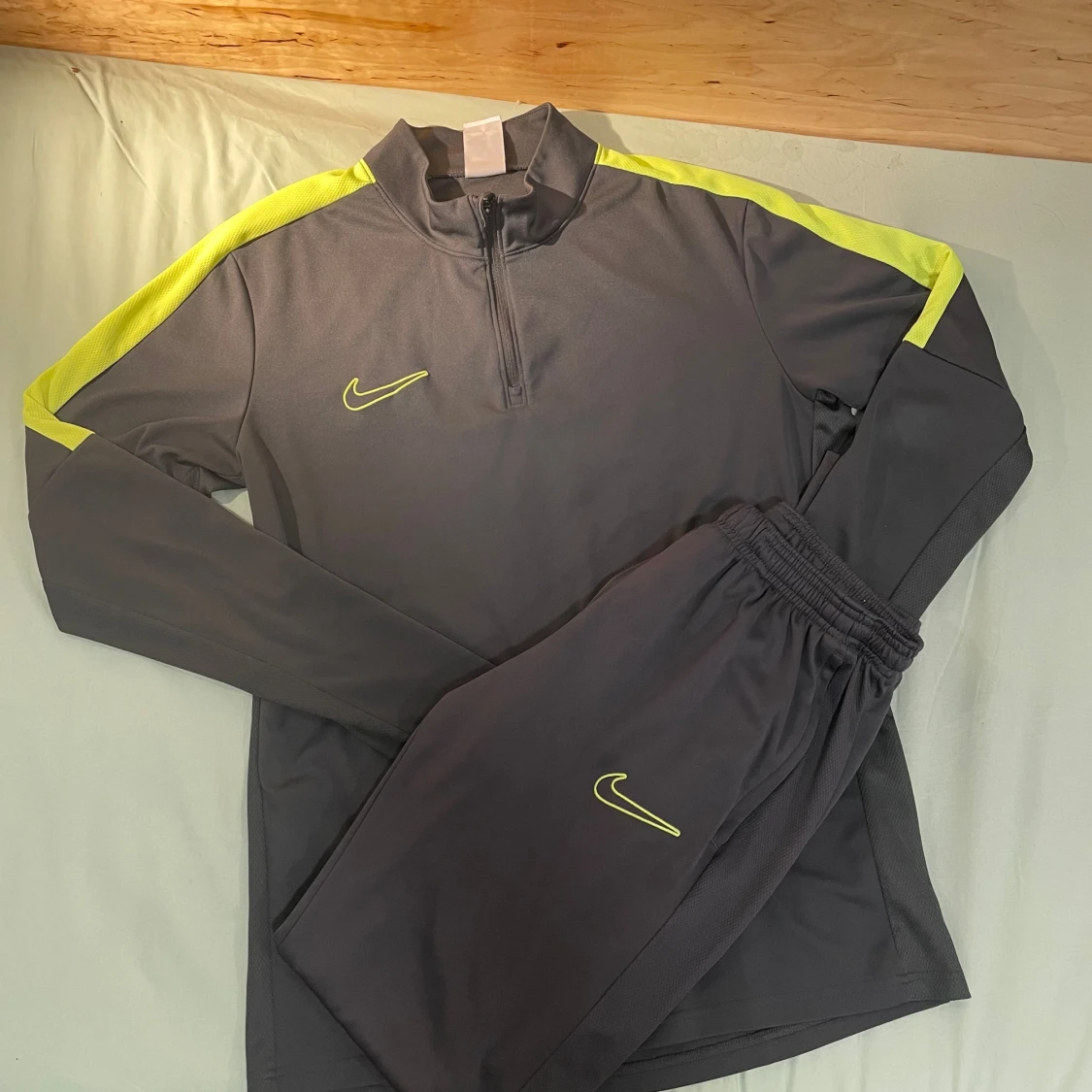 Nike Dri-Fit långärmad träningsöverdel i mörkgrått med neongula detaljer längs axlarna och halv dragkedja framtill. Perfekt för fotboll eller träning, tillverkad i lätt och snabbtorkande polyester. Snygg och sportig look med klassisk Nike-logga på bröstet.