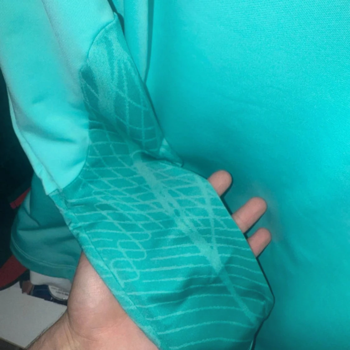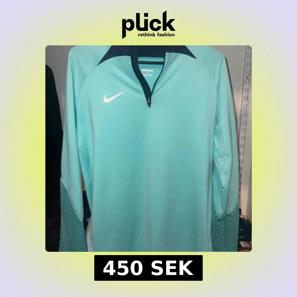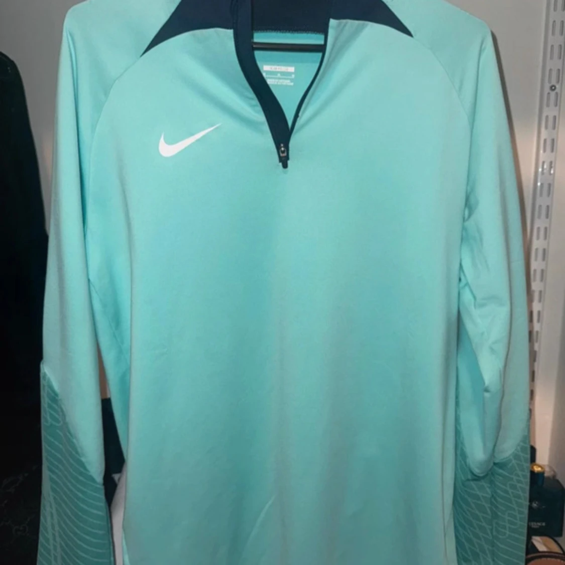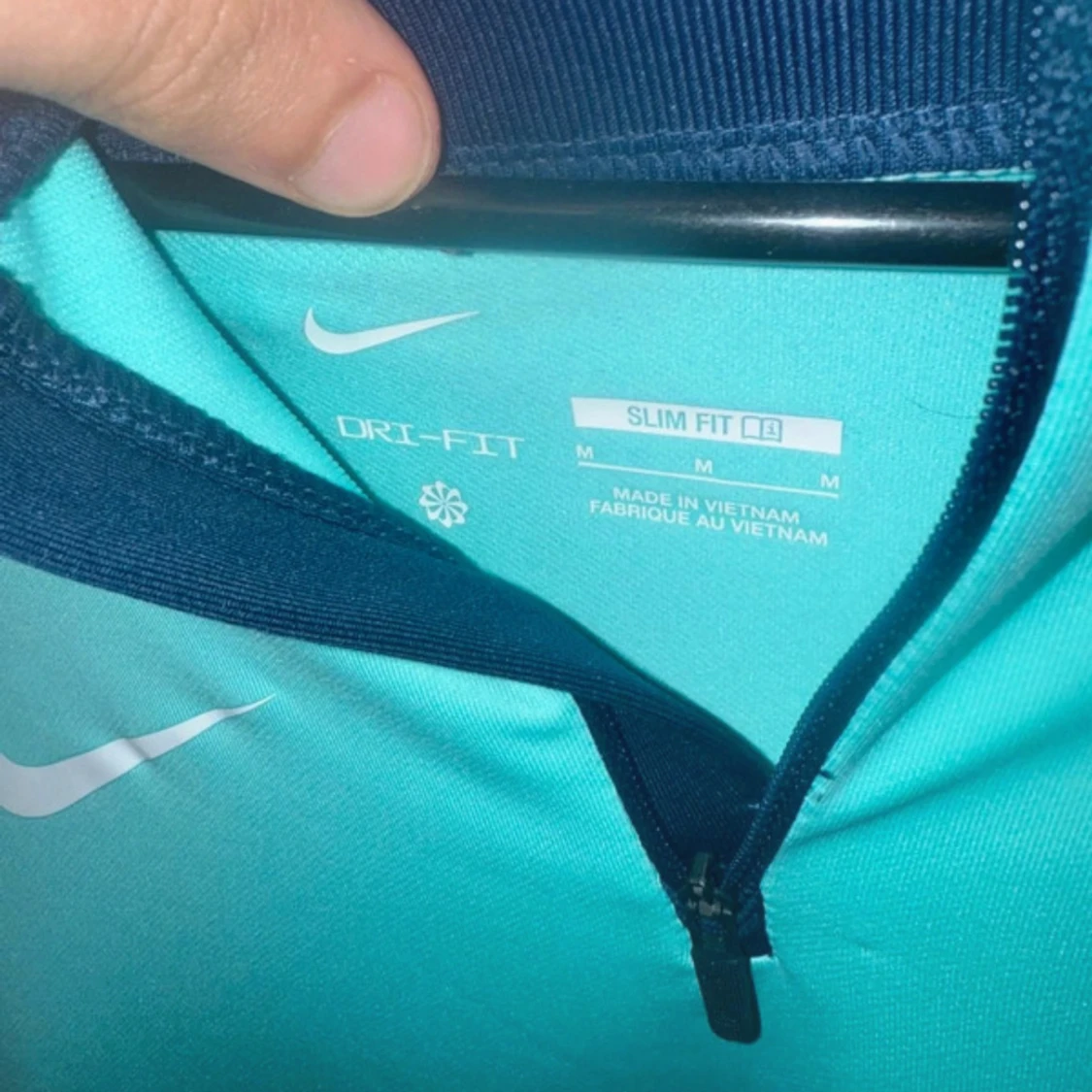 Nike Dri-Fit långärmad träningströja i turkos med mörkblå detaljer vid kragen och half zip. Slim fit-modell med coolt mönster på ärmarna. Perfekt för dig som vill ha en sportig och snygg look under träningen.