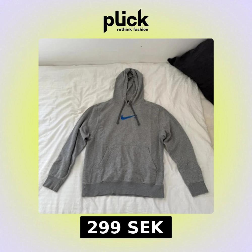 Säljer en grå hoodie från Nike med blå swoosh-logga på bröstet. Tröjan har huva med dragsko och en stor magficka framtill. Perfekt för en avslappnad stil och enkel att matcha med det mesta.
