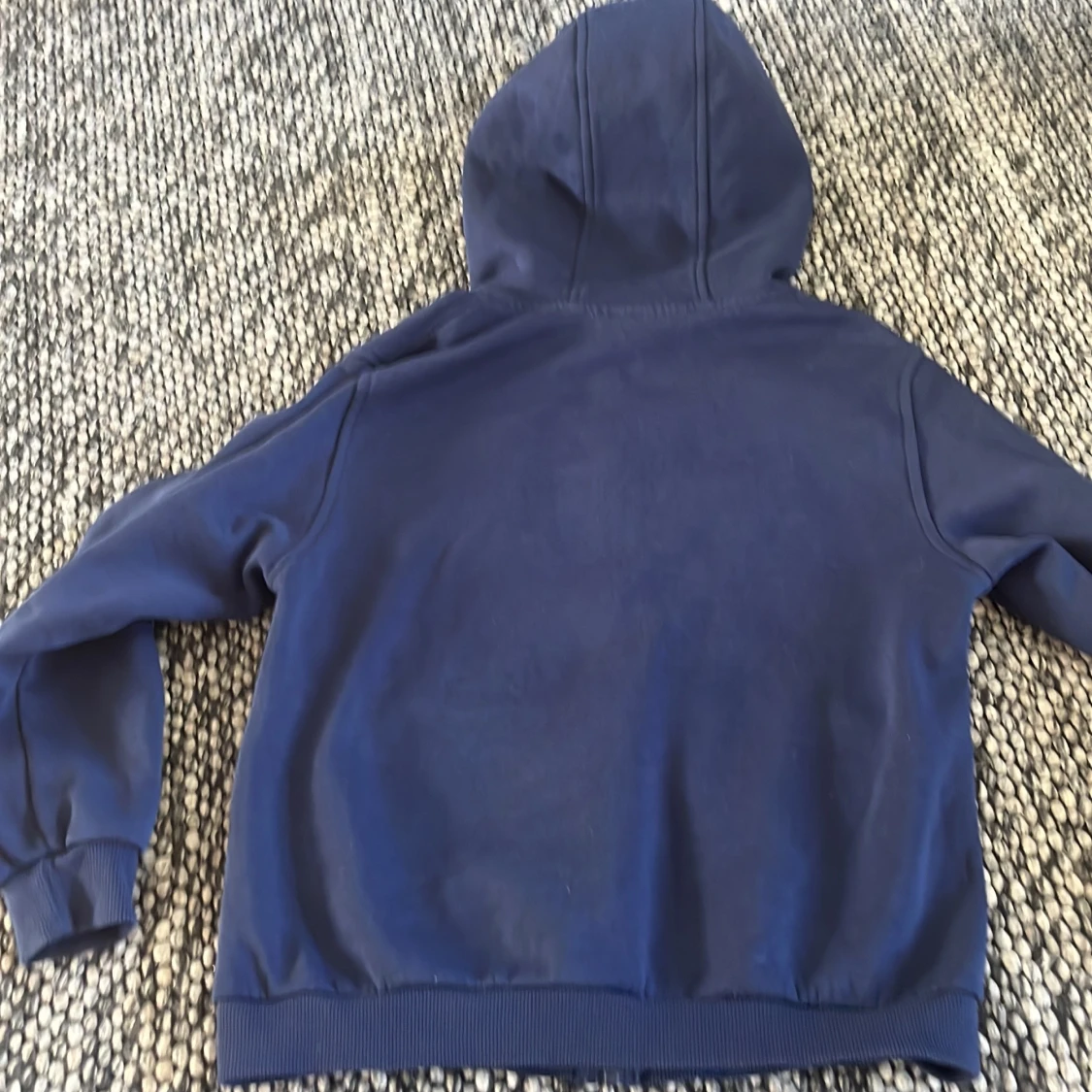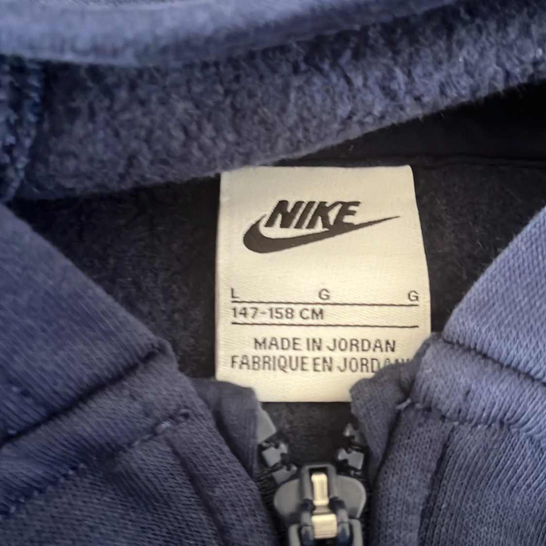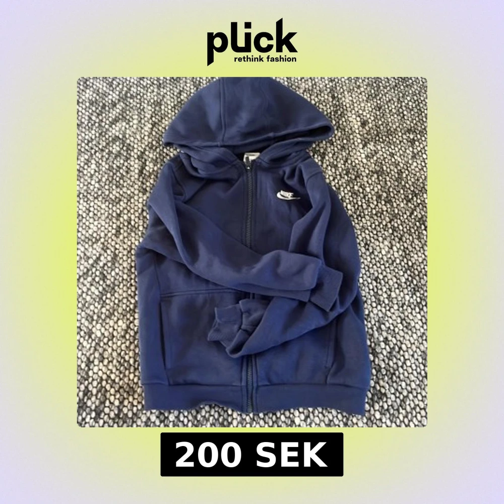 Säljer en mörkblå hoodie från Nike med dragkedja och huva. Tröjan har två fickor framtill och en vit Nike-logga på bröstet. Perfekt för en sportig och avslappnad stil.