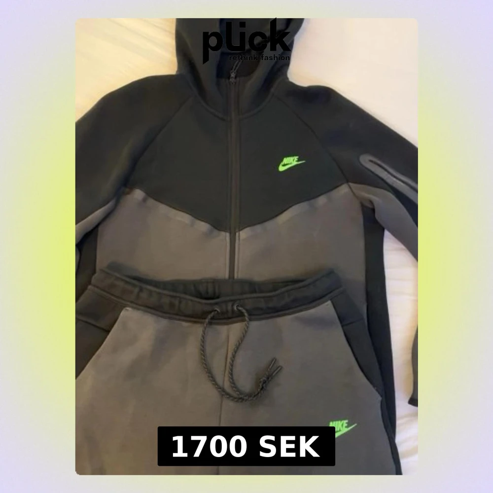 Nike Tech Fleece hoodie och mjukisbyxor i svart och grått med dragkedja och huva. Tröjan har en neongrön Nike-logga på bröstet och är tillverkad i ett mjukt och sportigt material. Perfekt för en streetwear-look eller till träningen. Nypris: 2500kr. Kvitto finns