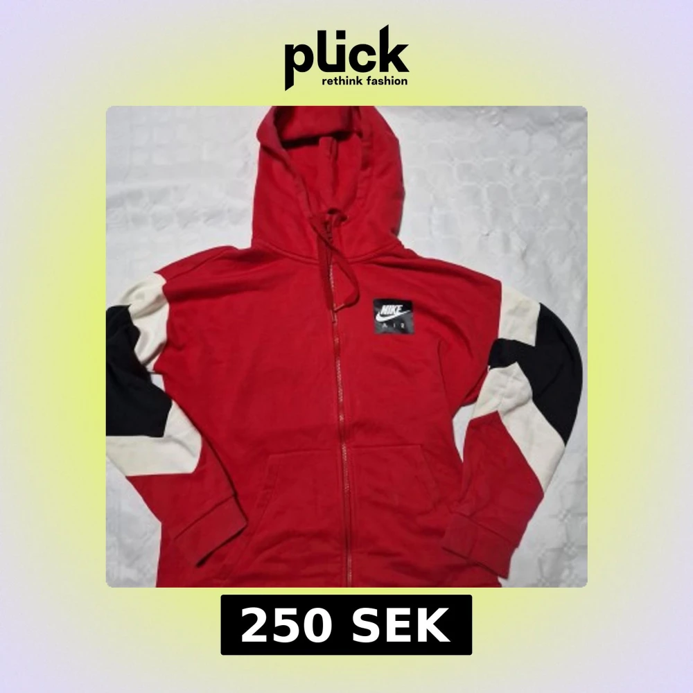 Säljer en röd hoodie från Nike Air med svart och vit detalj på ärmarna. Tröjan har huva med snörning, hel dragkedja och fickor framtill. Perfekt för dig som gillar sportig stil och streetwear.