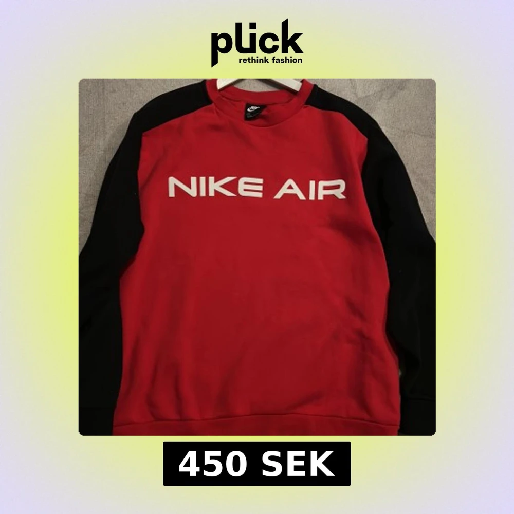 Säljer en snygg röd och svart tröja från Nike med texten 'NIKE AIR' på framsidan. Tröjan har långa ärmar och en klassisk rund halsringning. Perfekt för en sportig look!