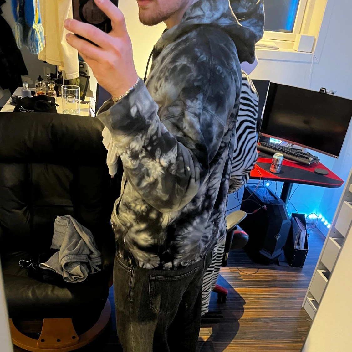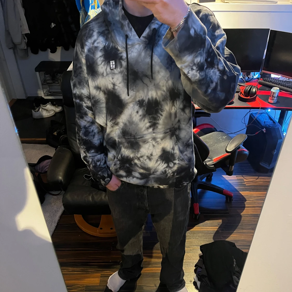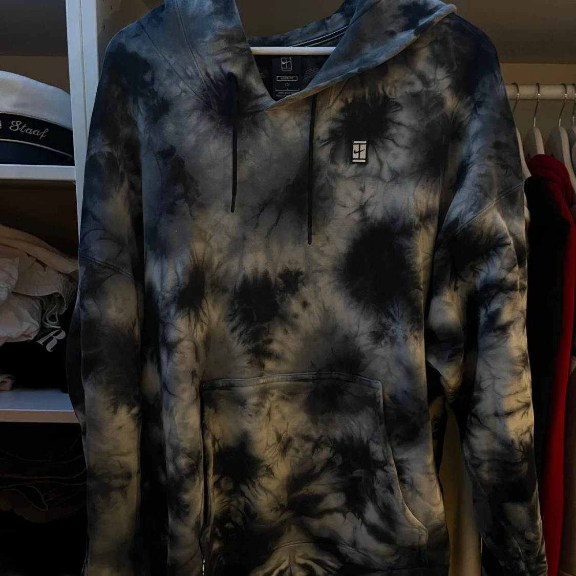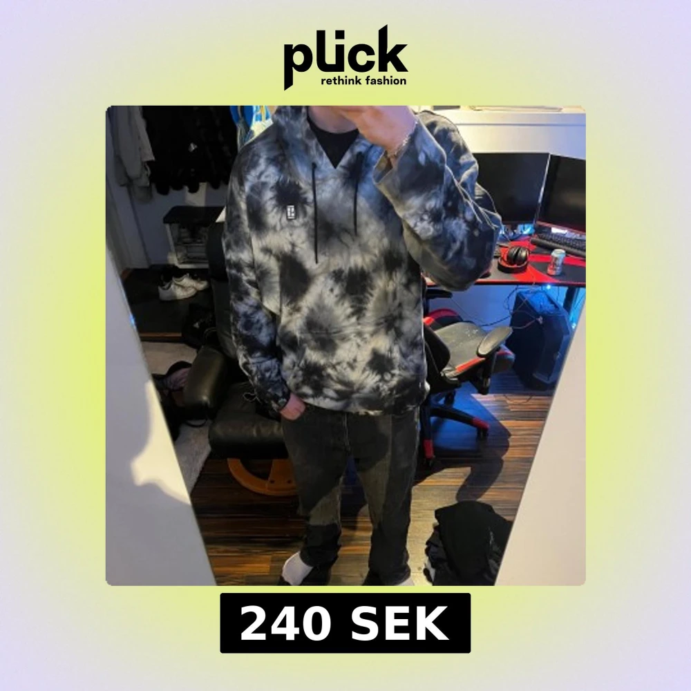 Säljer en snygg hoodie från Nike i svart och grå tie-dye. Tröjan har huva med dragsko och en stor magficka. Perfekt för dig som gillar streetwear och vill ha en unik look.