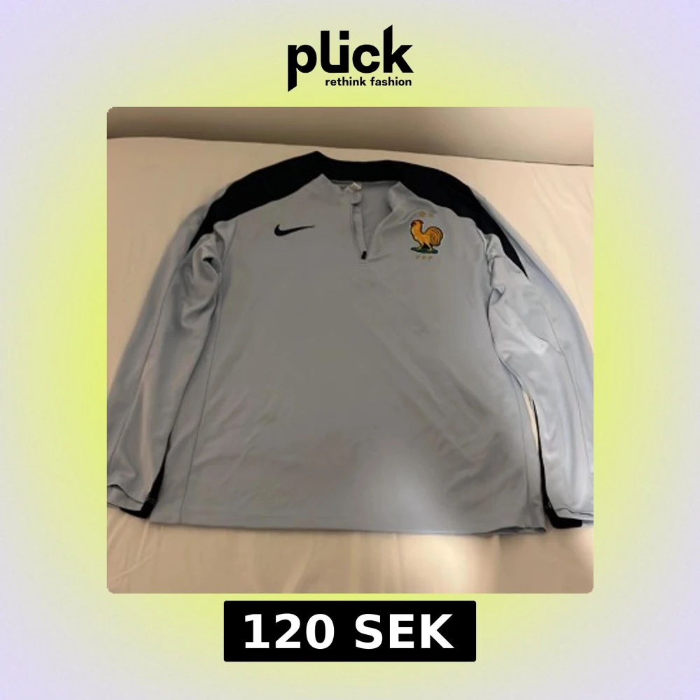 Säljer en ljusblå långärmad tröja från Nike med svart axelparti och broderad tupp-logga på bröstet. Tröjan är tillverkad i 100% polyester och har en dragkedja vid halsen. Perfekt för sportiga aktiviteter! Den är inte äkta men dock toppkvalitet